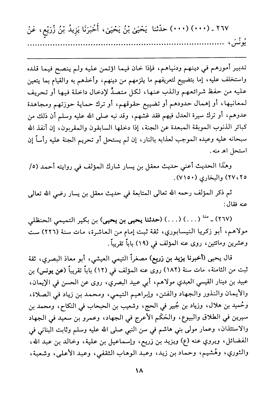 ٢٦٧ - (٠٠) (٠٠) حدَّثنا يَحْيَى بْنُ يَحْيَى، أَخْبَرَنَا يَزِيدُ بْنُ زُرَيعٍ، عَنْ يُونُسَ،