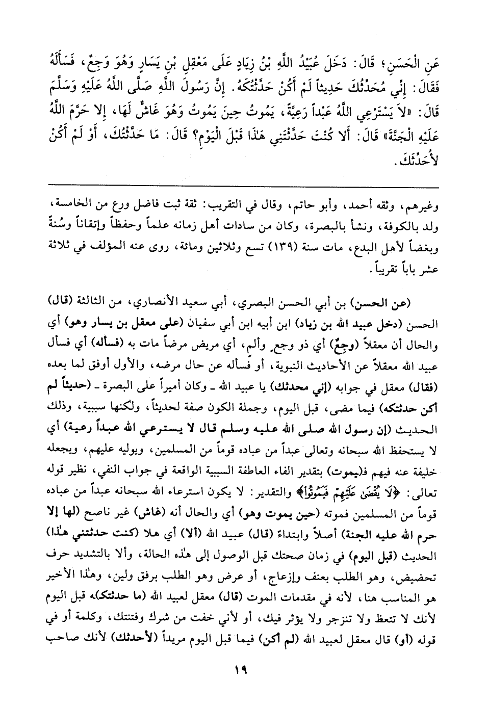 عَنِ الْحَسَنِ؛ قَال: دَخَلَ عُبَيدُ اللهِ بْنُ زِيَادٍ عَلَى مَعْقِلِ بْنِ يَسَارٍ وَهُوَ وَجِعٌ، فَسَأَلَهُ فَقَال: إِنِّي مُحَدِّثُكَ حَدِيثًا لَمْ أَكُنْ حَدَّثْتُكَهُ. إِنَّ رَسُولَ اللهِ صَلَّى اللهُ عَلَيهِ وَسَلَّمَ قَال: "لَا يَسْتَرْعِي اللهُ عَبْدًا رَعِيَّةً، يَمُوتُ حِينَ يَمُوتُ وَهُوَ غَاشٌّ لَهَا، إِلا حَرَّمَ اللهُ عَلَيهِ الْجَنَّةَ" قَال: ألا كُنْتَ حَدَّثْتَنِي هَذَا قَبْلَ الْيَوْمِ؟ قَال: مَا حَدَّثْتُكَ، أَوْ لَمْ أَكُنْ لأُحَدَّثَكَ