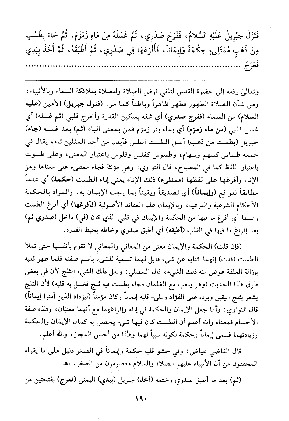 فَنَزَلَ جِبْرِيلُ عَلَيهِ السَّلامُ، فَفَرَجَ صَدْرِي، ثُمَّ غَسَلَهُ مِنْ مَاءِ زَمْزَمَ، ثُمَّ جَاءَ بِطَسْتٍ مِنْ ذَهَبٍ مُمْتَلِئٍ حِكْمَة وإِيِمَانًا، فَأَفْرَغَهَا فِي صَدْرِي، ثُمَّ أَطْبَقَهُ، ثُمَّ أَخَذَ بِيَدِي فَعَرَجَ