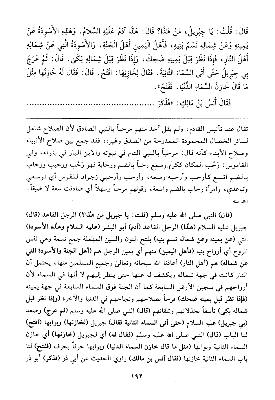 قَال: قُلْتُ: يَا جِبْرِيلُ، مَنْ هَذَا؟ قَال: هَذَا آدَمُ عَلَيهِ السَّلامُ. وَهَذِهِ الأَسْودَةُ عَنْ يَمِينِهِ وَعَنْ شِمَالِهِ نَسَمُ بَنِيهِ، فَأَهْلُ الْيَمِينِ أَهْلُ الْجَنَّةِ، وَالأسودَةُ التِي عَنْ شِمَالِهِ أَهْلُ النَّارِ، فَإِذَا نَظَرَ قِبَلَ يَمِينِهِ ضَحِكَ، وَإِذَا نَظَرَ قِبَلَ شِمَالِهِ بَكَى. قَال: ثُمَّ عَرَجَ بِي جِبْرِيلُ حَتَّى أَتَى السَّمَاءَ الثَّانِيَةَ. فَقَال لِخَازِنِهَا: افْتَحْ. قَال: فَقَال لَهُ خَازِنُهَا مِثْلَ مَا قَال خَازِنُ السَّمَاءِ الدُّنْيَا. فَفَتَحَ".