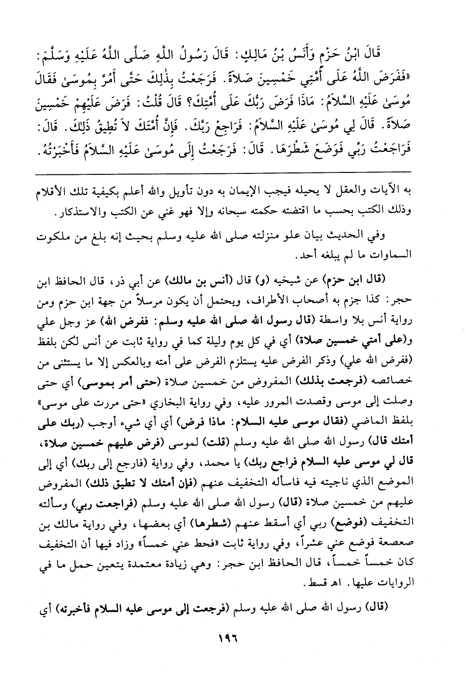 قَال ابْنُ حَزْمٍ وَأَنَسُ بْنُ مَالِكٍ: قَال رَسُولُ اللهِ صَلَّى اللهُ عَلَيهِ وَسَلَّمَ: "فَفَرَضَ اللهُ عَلَى أَمَّتِي خَمْسِينَ صَلاةً. فَرَجَعْتُ بِذلِكَ حَتَّى أَمُرَّ بِمُوسَى فَقَال مُوسَى عَلَيهِ السَّلامُ: مَاذَا فَرَضَ رَبُّكَ عَلَى أُمَّتِكَ؟ قَال قُلْتُ: فَرَضَ عَلَيهِمْ خَمْسِينَ صَلاةً. قَال لِي مُوسَى عَلَيهِ السَّلامُ: فَرَاجِعْ رَبَّكَ. فَإِن أُمَّتَكَ لَا تُطِيقُ ذَلِكَ. قَال: فَرَاجَعْتُ رَبِّي فَوَضَعَ شَطرَهَا. قَال: فَرَجَعْتُ إِلَى مُوسَى عَلَيهِ السَّلامُ فَأَخْبَرْتُهُ