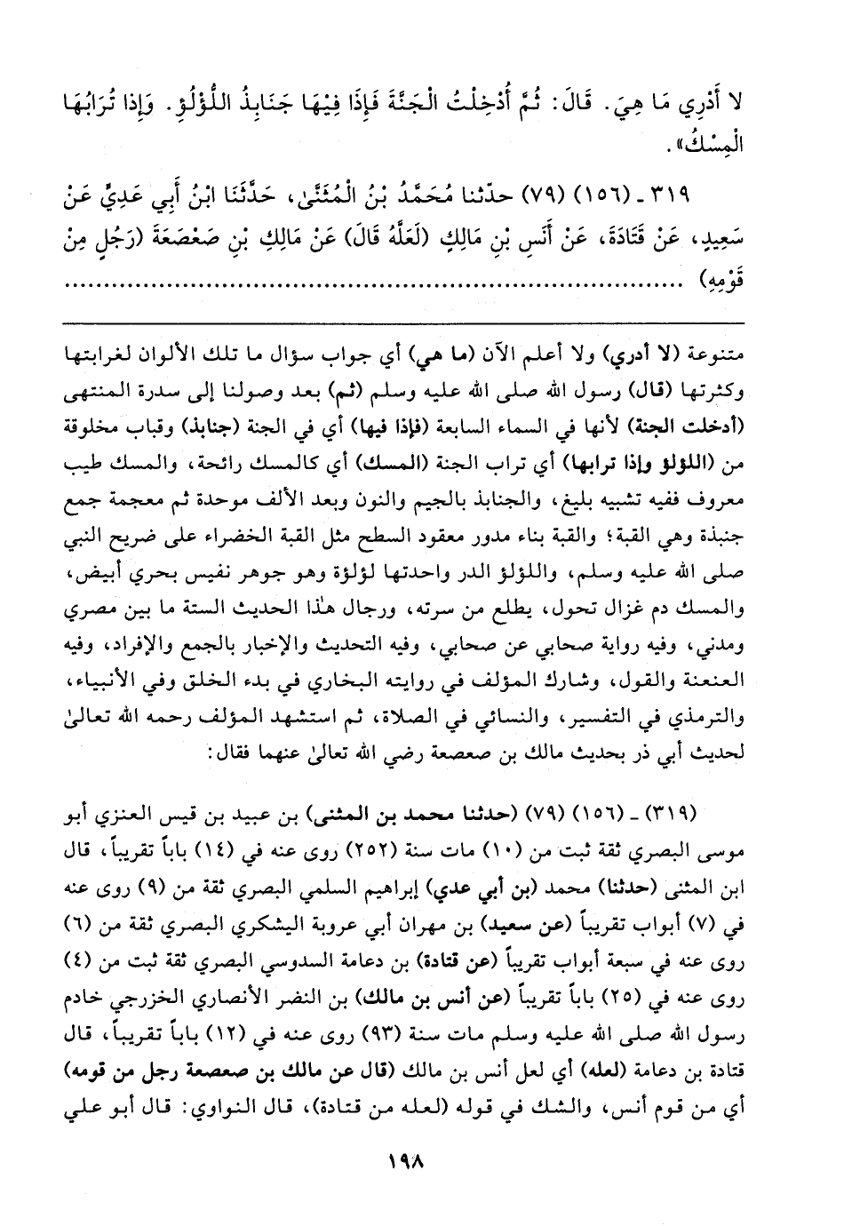 (٣١٩) - (١٥٦) (٧٩) (حدثنا محمد بن المثنى) بن عبيد بن قيس العنزي أبو موسى البصري ثقة ثبت من (١٠) مات سنة (٢٥٢) روى عنه في (١٤) بابًا تقريبًا، قال ابن المثنى (حدثنا) محمد (بن أبي عدي) إبراهيم السلمي البصري ثقة من (٩) روى عنه في (٧) أبواب تقريبًا (عن سعيد) بن مهران أبي عروبة اليشكري البصري ثقة من (٦) روى عنه في سبعة أبواب تقريبًا (عن قتادة) بن دعامة السدوسي البصري ثقة ثبت من (٤) روى عنه في (٢٥) بابًا تقريبًا (عن أنس بن مالك) بن النضر الأنصاري الخزرجي خادم رسول الله صلى الله عليه وسلم مات سنة (٩٣) روى عنه في (١٢) بابًا تقريبًا، قال قتادة بن دعامة (لعله) أي لعل أنس بن مالك (قال عن مالك بن صعصعة رجل من قومه) أي من قوم أنس، والشك في قوله (لعله من قتادة)، قال النواوي: قال أبو علي