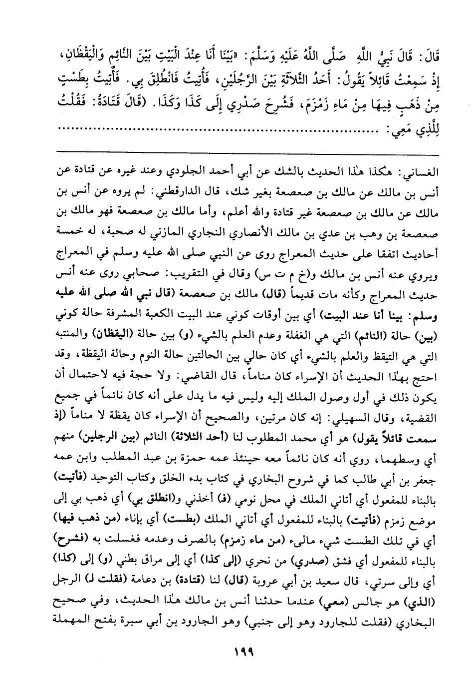 قَال: قَال نَبِيُّ اللهِ صَلَّى اللهُ عَلَيهِ وَسَلَّمَ: "بَينَا أَنَا عِنْدَ الْبَيتِ بَينَ النَّائِم وَالْيَقْظَانِ، إِذْ سَمِعْتُ قَائِلًا يَقُولُ: أَحَدُ الثَّلاثَةِ بَينَ الرَّجُلَينِ، فَأُتِيتُ فَانْطُلِقَ بِي. فَأتِيتُ بِطَسْتٍ مِنْ ذَهَبٍ فِيهَا مِنْ مَاءِ زَمْزَمَ، فَشُرِحَ صَدْرِي إِلَى كَذَا وَكَذَا. (قَال قَتَادَةُ: فَقُلْتُ لِلَّذِي مَعِي: