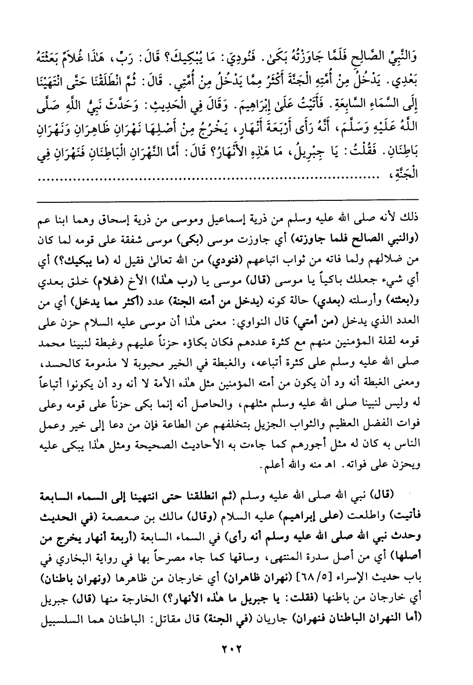 وَالنَّبِيِّ الصَّالِحِ فَلَمَّا جَاوَزْتُهُ بَكَى. فَنُودِيَ: مَا يُبْكِيكَ؟ قَال: رَبِّ، هذَا غُلامٌ بَعَثْتَهُ بَعْدِي. يَدْخُلُ مِنْ أُمَّتِهِ الْجَنَّةَ أَكْثَرُ مِمَّا يَدْخُلُ مِنْ أُمَّتِي. قَال: ثُمَّ انْطَلَقْنَا حَتَّى انْتَهَينَا إِلَى السَّمَاءِ السَّابِعَةِ. فَأَتَيتُ عَلَى إِبْرَاهِيمَ. وَقَال فِي الْحَدِيثِ: وَحَدَّثَ نَبِيُّ اللهِ صَلَّى اللهُ عَلَيهِ وَسَلَّمَ، أَنَّهُ رَأَى أَرْبَعَةَ أَنْهَارٍ، يَخْرُجُ مِنْ أَصْلِهَا نَهْرَانِ ظَاهِرَانِ وَنَهْرَانِ بَاطِنَانِ. فَقُلْتُ: يَا جِبْرِيلُ، مَا هَذِهِ الأَنْهَارُ؟ قَال: أَمَّا النهْرَانِ الْبَاطِنَانِ فَنَهْرَانِ فِي الْجَنَّةِ،