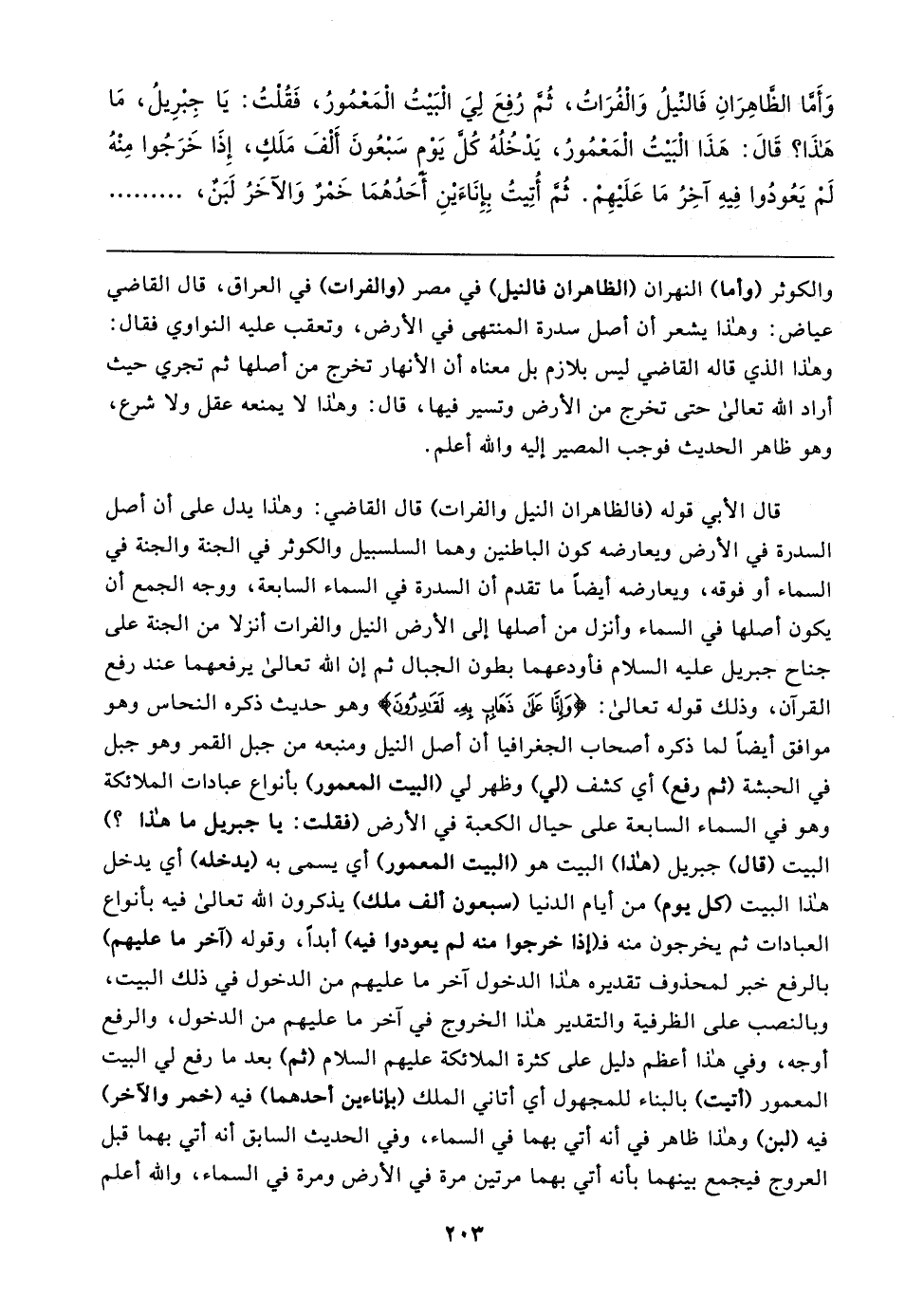 وَأمَّا الظَّاهِرَانِ فَالنِّيلُ وَالْفُرَاتُ، ثُمَّ رُفِعَ لِيَ الْبَيتُ الْمَعْمُورُ، فَقُلْتُ: يَا جِبْرِيلُ، مَا هَذَا؟ قَال: هَذَا الْبَيتُ الْمَعْمُورُ، يَدْخُلُهُ كُل يَوْمٍ سَبْعُونَ أَلْفَ مَلَكٍ، إِذَا خَرَجُوا مِنْهُ لَمْ يَعُودُوا فِيهِ آخِرُ مَا عَلَيهِمْ. ثُمَّ أُتِيتُ بِإِنَاءَينِ أحَدُهُمَا خَمْرٌ وَالآخَرُ لَبَنٌ،