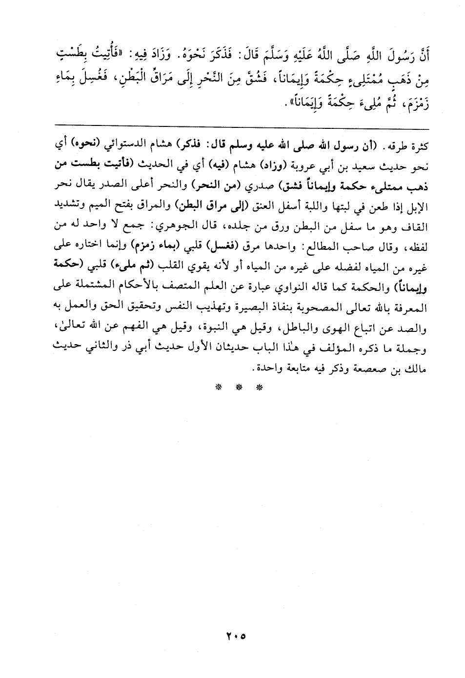 أَنَّ رَسُولَ اللهِ صَلَّى اللهُ عَلَيهِ وَسَلَّمَ قَال: فَذَكَرَ نَحْوَهُ. وَزَادَ فِيهِ: "فَأُتِيتُ بِطَسْتٍ مِنْ ذَهَب مُمْتَلِئٍ حِكْمَةً وَإِيمَانًا، فَشُقَّ مِنَ النَّحْرِ إِلَى مَرَاقِّ الْبَطْنِ، فَغُسِلَ بِمَاءِ زَمْزَمَ، ثُمَّ مُلِئَ حِكْمَةً وَإِيَمَانًا"