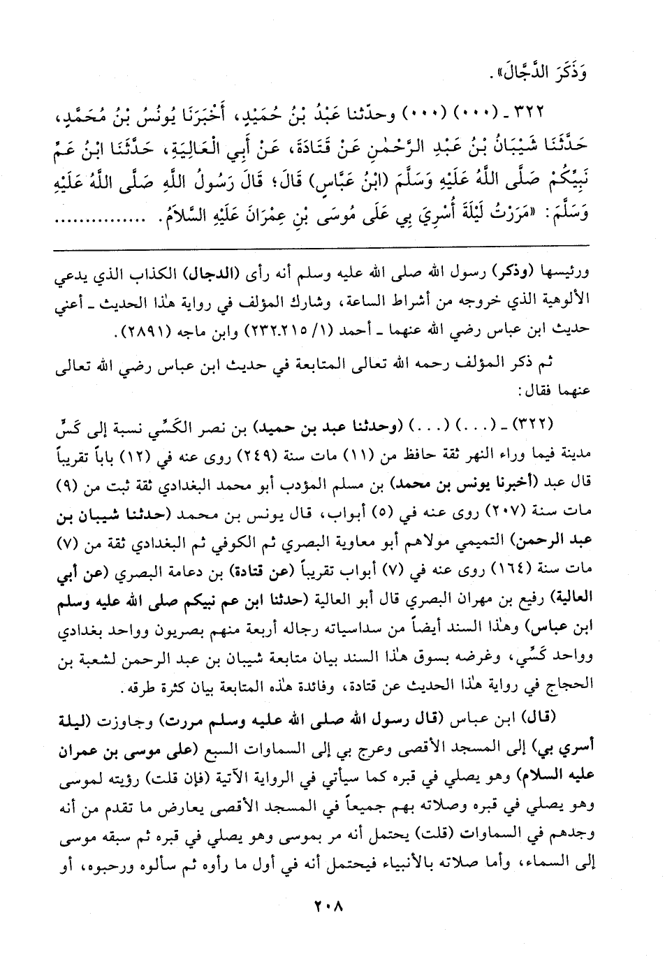 ٣٢٢ - (٠٠) (٠٠) وحدّثنا عَبْدُ بْنُ حُمَيدٍ، أَخْبَرَنَا يُونُسُ بْنُ مُحَمَّدٍ، حَدَّثَنَا شَيبَانُ بْنُ عَبْدِ الرَّحْمنِ عَنْ قَتَادَةَ، عَنْ أَبِي الْعَالِيَةِ، حَدَّثَنَا ابْنُ عَمِّ نَبِيِّكُمْ صَلَّى اللهُ عَلَيهِ وَسَلَّمَ (ابْنُ عَبَّاسٍ) قَال؛ قَال رَسُولُ اللهِ صَلَّى اللهُ عَلَيهِ وَسَلَّمَ: "مَرَرْتُ لَيلَةَ أُسْرِيَ بِي عَلَى مُوسَى بْنِ عِمْرَانَ عَلَيهِ السَّلامُ