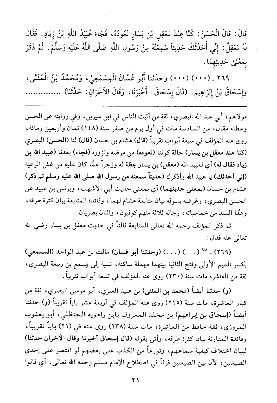 ٢٦٩ - (٠٠) (٠٠) وحدّثنا أَبُو غَسَّانَ الْمِسْمَعِيُّ، وَمُحَمَّدُ بْنُ الْمُثَنَّى، وإِسْحَاقُ بْنُ إِبْرَاهِيمَ. (قَال إِسْحَاقُ: أَخْبَرَنَا، وَقَال الآخَرَانِ: حَدَّثَنَا)
