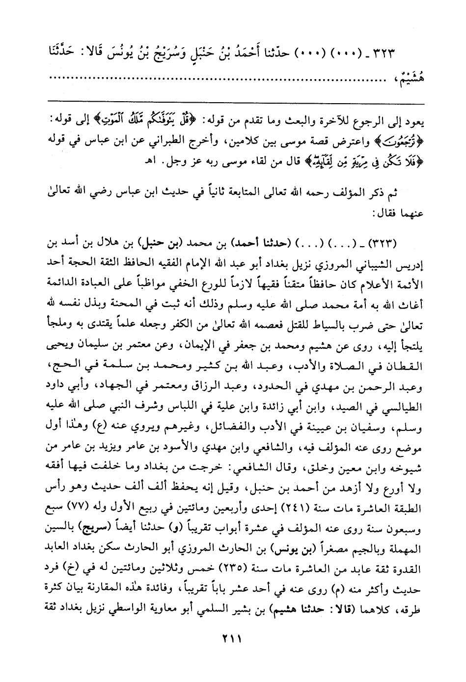 (٣٢٣) - (. . .) (. . .) (حدثنا أحمد) بن محمد (بن حنبل) بن هلال بن أسد بن إدريس الشيباني المروزي نزيل بغداد أبو عبد الله الإمام الفقيه الحافظ الثقة الحجة أحد الأئمة الأعلام كان حافظًا متقنًا فقيهًا لازمًا للورع الخفي مواظبًا على العبادة الدائمة أغاث الله به أمة محمد صلى الله عليه وسلم وذلك أنه ثبت في المحنة وبذل نفسه لله تعالى حتى ضرب بالسياط للقتل فعصمه الله تعالى من الكفر وجعله علمًا يقتدى به وملجأ يلتجأ إليه، روى عن هشيم ومحمد بن جعفر في الإيمان، وعن معتمر بن سليمان ويحيى القطان في الصلاة والأدب، وعبد الله بن كثير ومحمد بن سلمة في الحج، وعبد الرحمن بن مهدي في الحدود، وعبد الرزاق ومعتمر في الجهاد، وأبي داود الطيالسي في الصيد، وابن أبي زائدة وابن علية في اللباس وشرف النبي صلى الله عليه وسلم، وسفيان بن عيينة في الأدب والفضائل، وغيرهم ويروي عنه (ع) وهذا أول موضع روى عنه المؤلف فيه، والشافعي وابن مهدي والأسود بن عامر ويزيد بن عامر من شيوخه وابن معين وخلق، وقال الشافعي: خرجت من بغداد وما خلفت فيها أفقه ولا أورع ولا أزهد من أحمد بن حنبل، وقيل إنه يحفظ ألف ألف حديث وهو رأس الطبقة العاشرة مات سنة (٢٤١) إحدى وأربعين ومائتين في ربيع الأول وله (٧٧) سبع وسبعون سنة روى عنه المؤلف في عشرة أبواب تقريبًا (و) حدثنا أيضًا (سريج) بالسين المهملة وبالجيم مصغرًا (بن يونس) بن الحارث المروزي أبو الحارث سكن بغداد العابد القدوة ثقة عابد من العاشرة مات سنة (٢٣٥) خمس وثلاثين ومائتين له في (خ) فرد حديث وأكثر منه (م) روى عنه في أحد عشر بابًا تقريبًا، وفائدة هذه المقارنة بيان كثرة طرقه، كلاهما (قالا: حدثنا هشيم) بن بشير السلمي أبو معاوية الواسطي نزيل بغداد ثقة