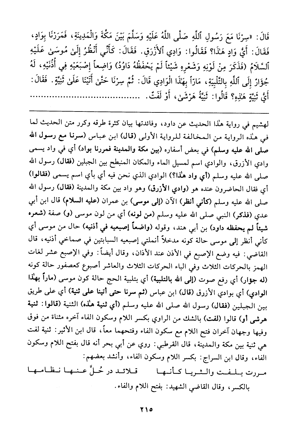 قَال: "سِرْنَا مَعَ رَسُولِ اللهِ صَلَّى اللهُ عَلَيهِ وَسَلَّمَ بَينَ مَكَّةَ وَالْمَدِينَةِ، فَمَرَرْنَا بِوَادٍ، فَقَال: أَيُّ وَادٍ هَذَا؟ فَقَالُوا: وَادِي الأَزْرَقِ. فَقَال: كَأَنِّي أَنْظُرُ إِلَى مُوسَى عَلَيهِ السَّلامُ (فَذَكَرَ مِنْ لَوْنِهِ وَشَعْرِهِ شَيئًا لَمْ يَحْفَظْهُ دَاوُدُ) وَاضِعًا إِصْبَعَيهِ فِي أُذُنَيهِ، لَهُ جُؤَارٌ إِلَى اللهِ بِالتَّلْبِيَةِ، مَارًّا بِهذَا الْوَادِي قَال: ثُمَّ سِرْنَا حَتَّى أَتَينَا عَلَى ثَنِيَّةٍ. فَقَال: أَيُّ ثَنِيَّةٍ هذِهِ؟ قَالُوا: ثَنِيَّةُ هَرْشَى، أَوْ لَفَتٌ