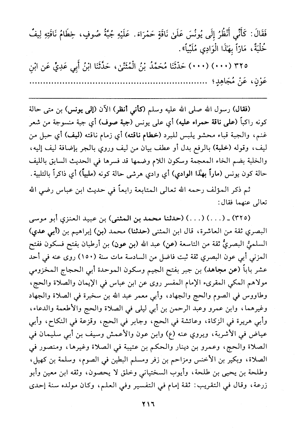 (٣٢٥) - (. . .) (. . .) (حدثنا محمد بن المثنى) بن عبيد العنزي أبو موسى البصري ثقة من العاشرة، قال ابن المثنى (حدثنا) محمد (بن) إبراهيم بن (أبي عدي) السلميُّ البصريُّ ثقة من التاسعة (عن) عبد الله (بن عون) بن أرطبان بفتح فسكون ففتح المزني أبي عون البصري ثقة ثبت فاضل من السادسة مات سنة (١٥٠) روى عنه في أحد عشر بابا (عن مجاهد) بن جبر بفتح الجيم وسكون الموحدة أبي الحجاج المخزومي مولاهم المكي المقرئ الإمام المفسر روى عن ابن عباس في الإيمان والصلاة والحج، وطاووس في الصوم والحج والجهاد، وأبي معمر عبد الله بن سخبرة في الصلاة والجهاد وغيرهما، وابن عمرو وعبد الرحمن بن أبي ليلى في الصلاة والحج والأطعمة والدعاء، وأبي هريرة في الزكاة، وعائشة في الحج، وجابر في الحج، وقزعة في النكاح، وأبي عياض في الأشربة، ويروي عنه (ع) وابن عون والأعمش وسيف بن أبي سليمان في الصلاة والحج، وعمرو بن دينار والحكم بن عتيبة في الصلاة وغيرها، ومنصور في الصلاة، وبكير بن الأخنس ومزاحم بن زفر ومسلم البطين في الصوم، وسلمة بن كهيل، وطلحة بن يحيى بن طلحة، وأيوب السختياني وخلق لا يحصون، وثقه ابن معين وأبو زرعة، وقال في التقريب: ثقة إمام في التفسير وفي العلم، وكان مولده سنة إحدى