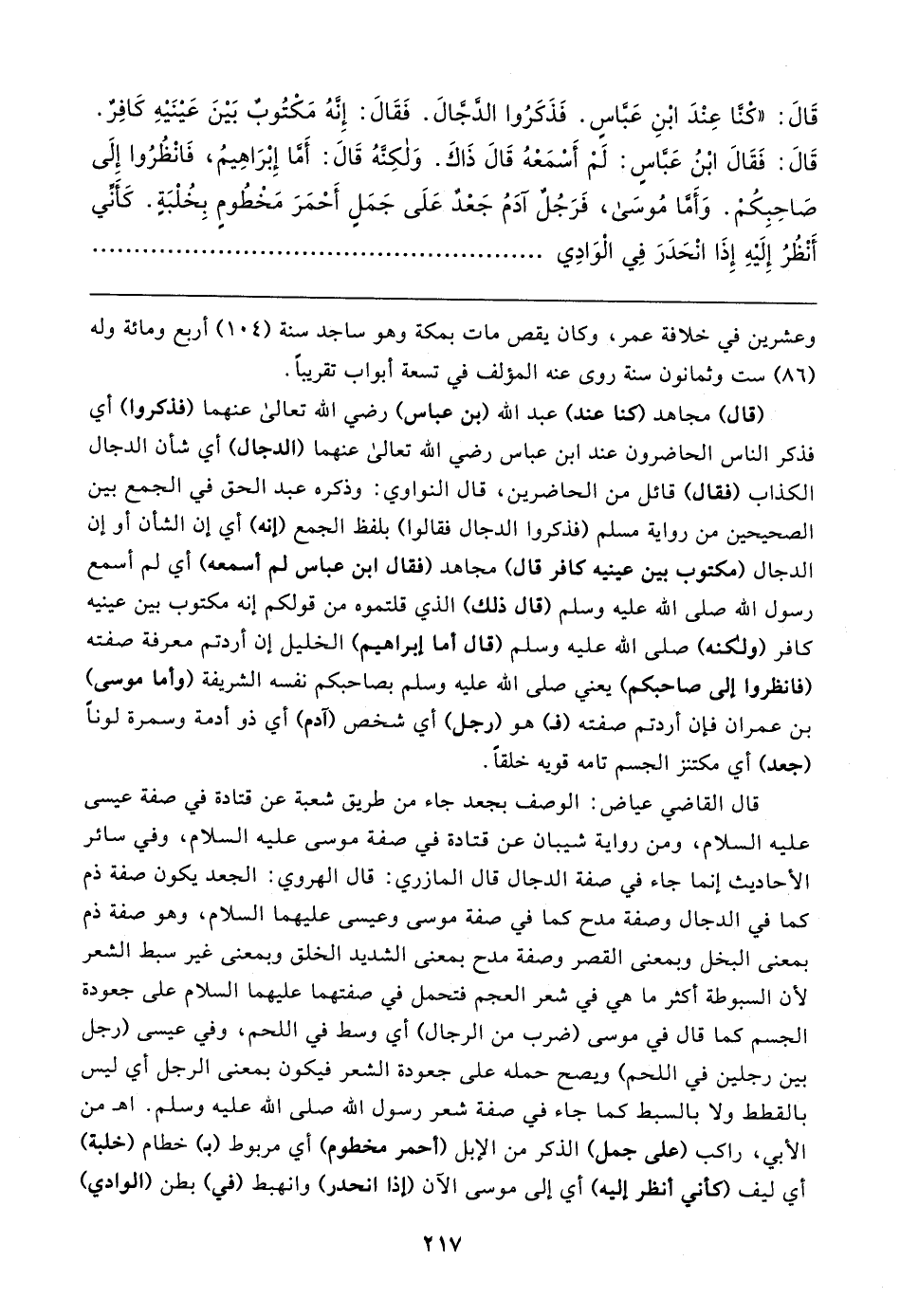 قَال: "كُنَّا عِنْدَ ابْنِ عَبَّاسٍ. فَذَكَرُوا الدَّجَّال. فَقَال: إِنَّهُ مَكْتُوبٌ بَينَ عَينَيهِ كَافِرٌ. قَال: فَقَال ابْنُ عَبَّاسٍ: لَمْ أَسْمَعْهُ قَال ذَاكَ. وَلكِنَّهُ قَال: أَمَّا إِبْرَاهِيمُ، فَانْظُرُوا إِلَى صَاحِبِكُمْ. وَأمَّا مُوسَى، فَرَجُل آدَمُ جَعْدٌ عَلَى جَمَلٍ أَحْمَرَ مَخْطُومٍ بِخُلْبَةِ. كَأَنِّي أَنْظُرُ إِلَيهِ إِذَا انْحَدَرَ فِي الْوَادِي