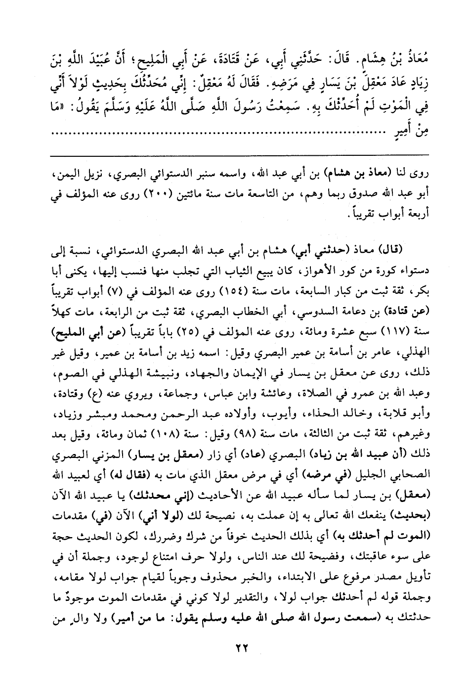 مُعَاذُ بْنُ هِشَامٍ. قَال: حَدَّثَنِي أَبِي، عَنْ قَتَادَةَ، عَنْ أَبِي الْمَلِيحِ؛ أَن عُبَيدَ اللهِ بْنَ زِيَادٍ عَادَ مَعْقِلَ بْنَ يَسَارٍ فِي مَرَضِهِ. فَقَال لَهُ مَعْقِلٌ: إِنِّي مُحَدِّثُكَ بِحَدِيثٍ لَوْلَا أَنِّي فِي الْمَوْتِ لَمْ أُحَدِّثْكَ بِهِ. سَمِعْتُ رَسُولَ اللهِ صَلَّى اللهُ عَلَيهِ وَسَلَّمَ يَقُولُ: "مَا مِنْ أمِيرٍ