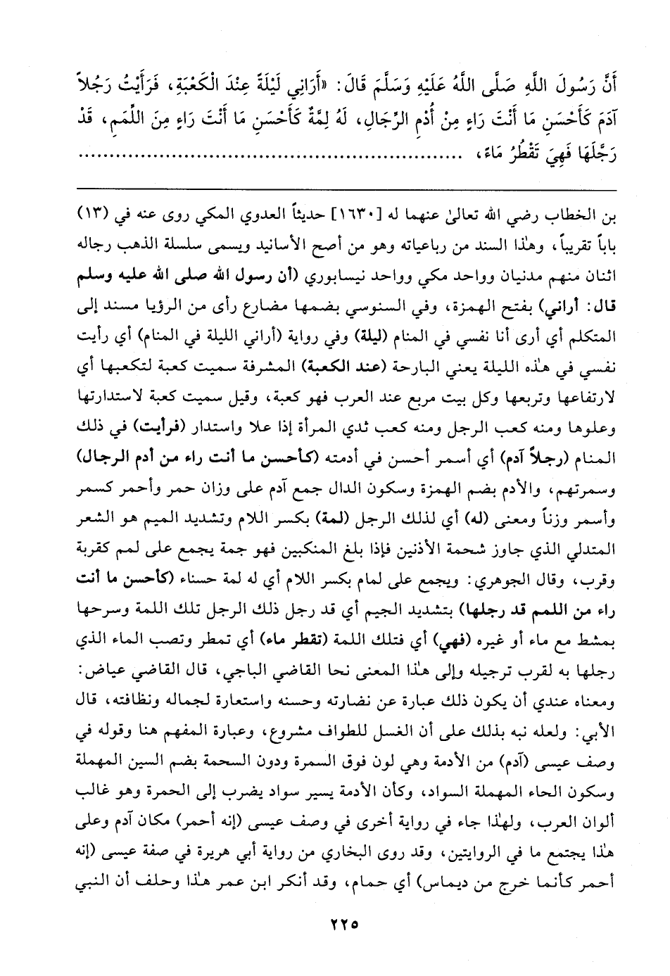 بن الخطاب رضي الله تعالى عنهما له [١٦٣٠] حديثًا العدوي المكي روى عنه في (١٣) بابًا تقريبًا، وهذا السند من رباعياته وهو من أصح الأسانيد ويسمى سلسلة الذهب رجاله اثنان منهم مدنيان وواحد مكي وواحد نيسابوري (أن رسول الله صلى الله عليه وسلم قال: أراني) بفتح الهمزة، وفي السنوسي بضمها مضارع رأى من الرؤيا مسند إلى المتكلم أي أرى أنا نفسي في المنام (ليلة) وفي رواية (أراني الليلة في المنام) أي رأيت نفسي في هذه الليلة يعني البارحة (عند الكعبة) المشرفة سميت كعبة لتكعبها أي لارتفاعها وتربعها وكل بيت مربع عند العرب فهو كعبة، وقيل سميت كعبة لاستدارتها وعلوها ومنه كعب الرجل ومنه كعب ثدي المرأة إذا علا واستدار (فرأيت) في ذلك المنام (رجلًا آدم) أي أسمر أحسن في أدمته (كأحسن ما أنت راء من أدم الرجال) وسمرتهم، والأدم بضم الهمزة وسكون الدال جمع آدم على وزان حمر وأحمر كسمر وأسمر وزنًا ومعنى (له) أي لذلك الرجل (لمة) بكسر اللام وتشديد الميم هو الشعر المتدلي الذي جاوز شحمة الأذنين فإذا بلغ المنكبين فهو جمة يجمع على لمم كقربة وقرب، وقال الجوهري: ويجمع على لمام بكسر اللام أي له لمة حسناء (كأحسن ما أنت راء من اللمم قد رجلها) بتشديد الجيم أي قد رجل ذلك الرجل تلك اللمة وسرحها بمشط مع ماء أو غيره (فهي) أي فتلك اللمة (تقطر ماء) أي تمطر وتصب الماء الذي رجلها به لقرب ترجيله وإلى هذا المعنى نحا القاضي الباجي، قال القاضي عياض: ومعناه عندي أن يكون ذلك عبارة عن نضارته وحسنه واستعارة لجماله ونظافته، قال الأبي: ولعله نبه بذلك على أن الغسل للطواف مشروع، وعبارة المفهم هنا وقوله في وصف عيسى (آدم) من الأدمة وهي لون فوق السمرة ودون السحمة بضم السين المهملة وسكون الحاء المهملة السواد، وكان الأدمة يسير سواد يضرب إلى الحمرة وهو غالب ألوان العرب، ولهذا جاء في رواية أخرى في وصف عيسى (إنه أحمر) مكان آدم وعلى هذا يجتمع ما في الروايتين، وقد روى البخاري من رواية أبي هريرة في صفة عيسى (إنه أحمر كأنما خرج من ديماس) أي حمام، وقد أنكر ابن عمر هذا وحلف أن النبي