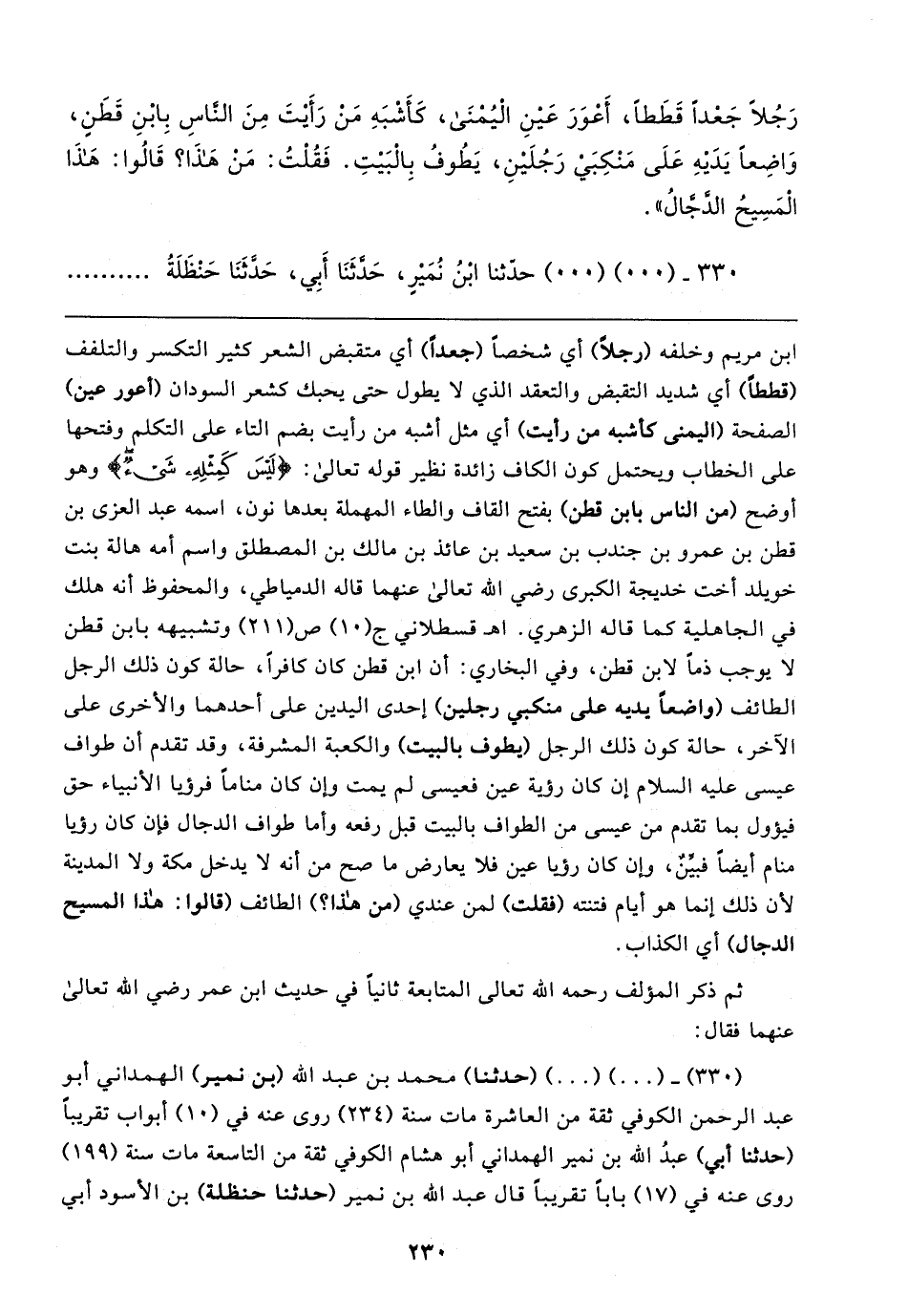 (٣٣٠) - (٠٠) (٠٠) (حدثنا) محمد بن عبد الله (بن نمير) الهمداني أبو عبد الرحمن الكوفي ثقة من العاشرة مات سنة (٢٣٤) روى عنه في (١٠) أبواب تقريبًا (حدثنا أبي) عبدُ الله بن نمير الهمداني أبو هشام الكوفي ثقة من التاسعة مات سنة (١٩٩) روى عنه في (١٧) بابًا تقريبًا قال عبد الله بن نمير (حدثنا حنظلة) بن الأسود أبي