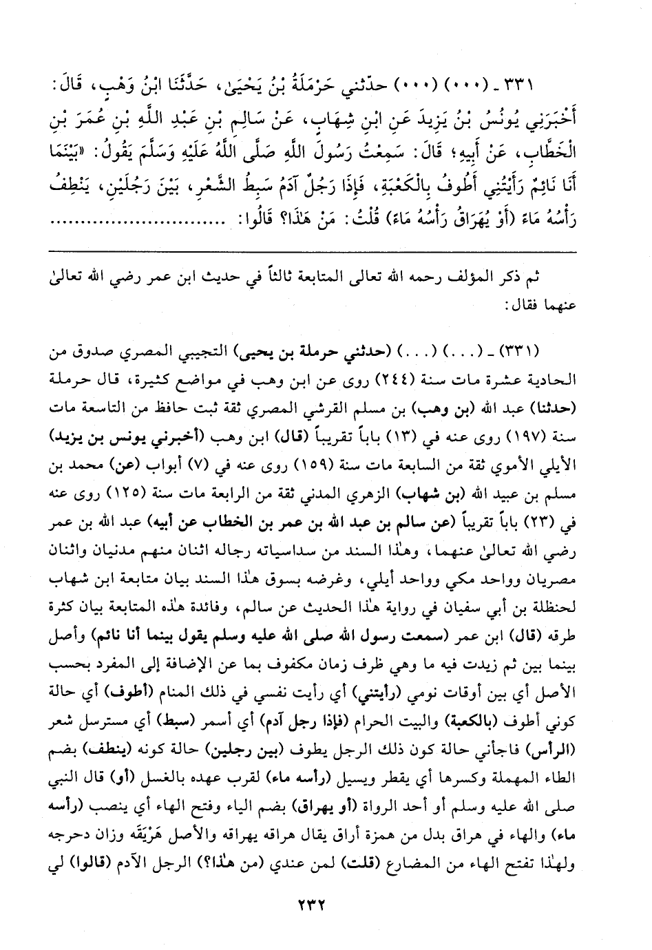 (٣٣١) - (٠٠) (٠٠) (حدثني حرملة بن يحيى) التجيبي المصري صدوق من الحادية عشرة مات سنة (٢٤٤) روى عن ابن وهب في مواضع كثيرة، قال حرملة (حدثنا) عبد الله (بن وهب) بن مسلم القرشي المصري ثقة ثبت حافظ من التاسعة مات سنة (١٩٧) روى عنه في (١٣) بابًا تقريبًا (قال) ابن وهب (أخبرني يونس بن يزيد) الأيلي الأموي ثقة من السابعة مات سنة (١٥٩) روى عنه في (٧) أبواب (عن) محمد بن مسلم بن عبيد الله (بن شهاب) الزهري المدني ثقة من الرابعة مات سنة (١٢٥) روى عنه في (٢٣) بابًا تقريبًا (عن سالم بن عبد الله بن عمر بن الخطاب عن أبيه) عبد الله بن عمر رضي الله تعالى عنهما، وهذا السند من سداسياته رجاله اثنان منهم مدنيان واثنان مصريان وواحد مكي وواحد أيلي، وغرضه بسوق هذا السند بيان متابعة ابن شهاب لحنظلة بن أبي سفيان في رواية هذا الحديث عن سالم، وفائدة هذه المتابعة بيان كثرة طرقه (قال) ابن عمر (سمعت رسول الله صلى الله عليه وسلم يقول بينما أنا نائم) وأصل بينما بين ثم زيدت فيه ما وهي ظرف زمان مكفوف بما عن الإضافة إلى المفرد بحسب الأصل أي بين أوقات نومي (رأيتني) أي رأيت نفسي في ذلك المنام (أطوف) أي حالة كوني أطوف (بالكعبة) والبيت الحرام (فإذا رجل آدم) أي أسمر (سبط) أي مسترسل شعر (الرأس) فاجأني حالة كون ذلك الرجل يطوف (بين رجلين) حالة كونه (ينطف) بضم الطاء المهملة وكسرها أي يقطر ويسيل (رأسه ماء) لقرب عهده بالغسل (أو) قال النبي صلى الله عليه وسلم أو أحد الرواة (أو يهراق) بضم الياء وفتح الهاء أي ينصب (رأسه ماء) والهاء في هراق بدل من همزة أراق يقال هراقه يهراقه والأصل هَرْيَقَه وزان دحرجه ولهذا تفتح الهاء من المضارع (قلت) لمن عندي (من هذا؟ ) الرجل الآدم (قالوا) لي