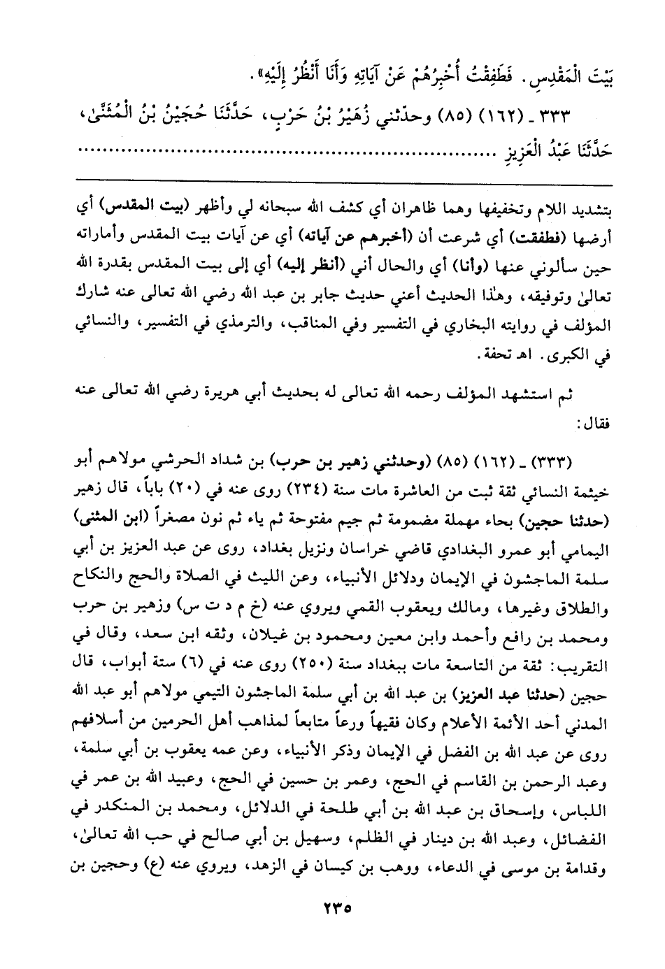 ٣٣٣ - (١٦٢) (٨٥) وحدَّثني زُهَيرُ بْنُ حَرْبٍ، حَدَّثَنَا حُجَينُ بْنُ الْمُثَنَّى، حَدَّثَنَا عَبْدُ الْعَزِيزِ