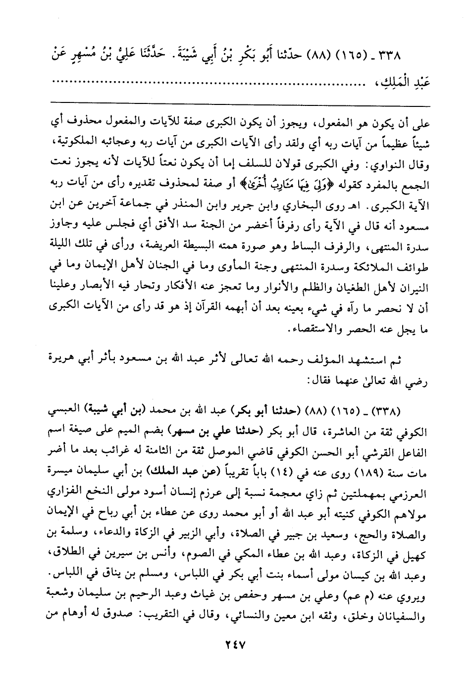 ٣٣٨ - (١٦٥) (٨٨) حدَّثنا أبُو بَكْرِ بْنُ أَبِي شَيبَةَ. حَدَّثَنَا عَلِيُّ بْنُ مُسْهِرٍ عَنْ عَبْدِ الْمَلِكِ،
