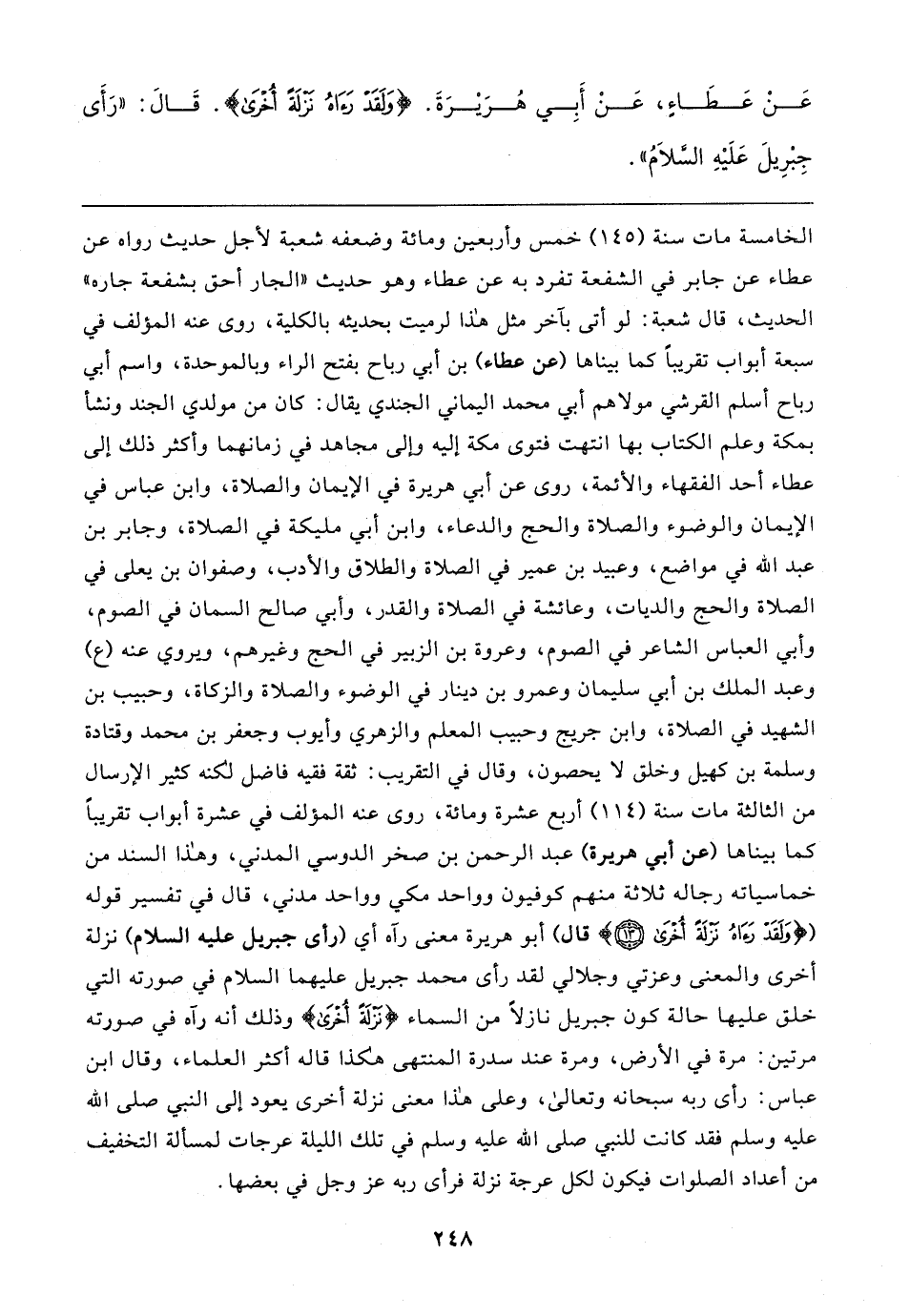 الخامسة مات سنة (١٤٥) خمس وأربعين ومائة وضعفه شعبة لأجل حديث رواه عن عطاء عن جابر في الشفعة تفرد به عن عطاء وهو حديث "الجار أحق بشفعة جاره " الحديث، قال شعبة: لو أتى بآخر مثل هذا لرميت بحديثه بالكلية، روى عنه المؤلف في سبعة أبواب تقريبًا كما بيناها (عن عطاء) بن أبي رباح بفتح الراء وبالموحدة، واسم أبي رباح أسلم القرشي مولاهم أبي محمد اليماني الجندي يقال: كان من مولدي الجند ونشأ بمكة وعلم الكتاب بها انتهت فتوى مكة إليه وإلى مجاهد في زمانهما وأكثر ذلك إلى عطاء أحد الفقهاء والأئمة، روى عن أبي هريرة في الإيمان والصلاة، وابن عباس في الإيمان والوضوء والصلاة والحج والدعاء، وابن أبي مليكة في الصلاة، وجابر بن عبد الله في مواضع، وعبيد بن عمير في الصلاة والطلاق والأدب، وصفوان بن يعلى في الصلاة والحج والديات، وعائشة في الصلاة والقدر، وأبي صالح السمان في الصوم، وأبي العباس الشاعر في الصوم، وعروة بن الزبير في الحج وغيرهم، ويروي عنه (ع) وعبد الملك بن أبي سليمان وعمرو بن دينار في الوضوء والصلاة والزكاة، وحبيب بن الشهيد في الصلاة، وابن جريج وحبيب المعلم والزهري وأيوب وجعفر بن محمد وقتادة وسلمة بن كهيل وخلق لا يحصون، وقال في التقريب: ثقة فقيه فاضل لكنه كثير الإرسال من الثالثة مات سنة (١١٤) أربع عشرة ومائة، روى عنه المؤلف في عشرة أبواب تقريبًا كما بيناها (عن أبي هريرة) عبد الرحمن بن صخر الدوسي المدني، وهذا السند من خماسياته رجاله ثلاثة منهم كوفيون وواحد مكي وواحد مدني، قال في تفسير قوله {وَلَقَدْ رَآهُ نَزْلَةً أُخْرَى (١٣)} قال) أبو هريرة معنى رآه أي (رأى جبريل - عليه السلام -) نزلة أخرى والمعنى وعزتي وجلالي لقد رأى محمد جبريل عليهما السلام في صورته التي خلق عليها حالة كون جبريل نازلًا من السماء {نَزْلَةً أُخْرَى} وذلك أنه رآه في صورته مرتين: مرة في الأرض، ومرة عند سدرة المنتهى هكذا قاله أكثر العلماء، وقال ابن عباس: رأى ربه سبحانه وتعالى، وعلى هذا معنى نزلة أخرى يعود إلى النبي صلى الله عليه وسلم فقد كانت للنبي صلى الله عليه وسلم في تلك الليلة عرجات لمسألة التخفيف من أعداد الصلوات فيكون لكل عرجة نزلة فرأى ربه عزَّ وجلَّ في بعضها.