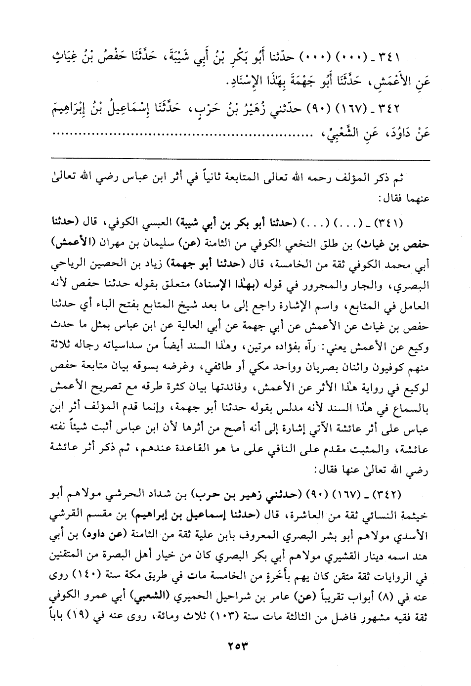 (٣٤١) - (٠٠) (٠٠) (حدثنا أبو بكر بن أبي شيبة) العبسي الكوفي، قال (حدثنا حفص بن غياث) بن طلق النخعي الكوفي من الثامنة (عن) سليمان بن مهران (الأعمش) أبي محمد الكوفي ثقة من الخامسة، قال (حدثنا أبو جهمة) زياد بن الحصين الرياحي البصري، والجار والمجرور في قوله (بهذا الإسناد) متعلق بقوله حدثنا حفص لأنه العامل في المتابع، واسم الإشارة راجع إلى ما بعد شيخ المتابع بفتح الباء أي حدثنا حفص بن غياث عن الأعمش عن أبي جهمة عن أبي العالية عن ابن عباس بمثل ما حدث وكيع عن الأعمش يعني: رآه بفؤاده مرتين، وهذا السند أيضًا من سداسياته رجاله ثلاثة منهم كوفيون واثنان بصريان وواحد مكي أو طائفي، وغرضه بسوقه بيان متابعة حفص لوكيع في رواية هذا الأثر عن الأعمش، وفائدتها بيان كثرة طرقه مع تصريح الأعمش بالسماع في هذا السند لأنه مدلس بقوله حدثنا أبو جهمة، وإنما قدم المؤلف أثر ابن عباس على أثر عائشة الآتي إشارة إلى أنه أصح من أثرها لأن ابن عباس أثبت شيئًا نفته عائشة، والمثبت مقدم على النافي على ما هو القاعدة عندهم، ثم ذكر أثر عائشة رضي الله تعالى عنها فقال: