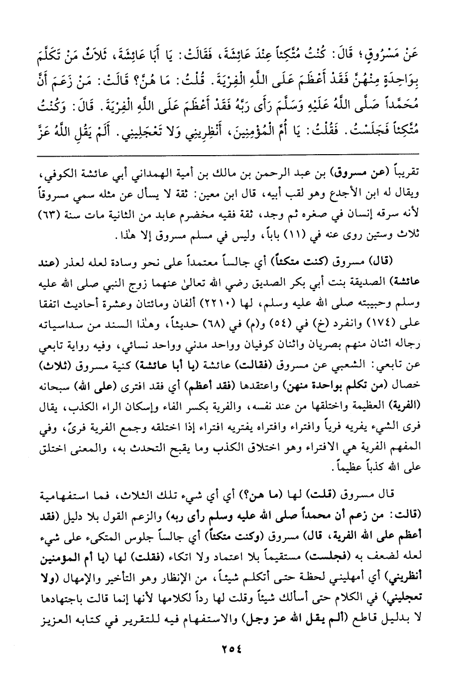 عَنْ مَسْرُوقٍ؛ قَال: كُنْتُ مُتَّكِئًا عِنْدَ عَائِشَةَ، فَقَالتْ: يَا أبَا عَائِشَةَ، ثَلاثٌ مَنْ تَكَلَّمَ بِوَاحِدَةٍ مِنْهُنَّ فَقَدْ أَعْظَمَ عَلَى اللهِ الْفِرْيَةَ. قُلْتُ: مَا هُنَّ؟ قَالتْ: مَنْ زَعَمَ أَن مُحَمَّدًا صَلَّى اللهُ عَلَيهِ وَسَلَّمَ رَأَى رَبَّهُ فَقَدْ أَعْظَمَ عَلَى اللهِ الْفِرْيَةَ. قَال: وَكُنْتُ مُتَّكِئًا فَجَلَسْتُ. فَقُلْتُ: يَا أُمَّ الْمُؤْمِنِينَ، أَنْظِرِينِي وَلا تَعْجَلِينِي. ألَمْ يَقُلِ اللهُ عَزَّ
