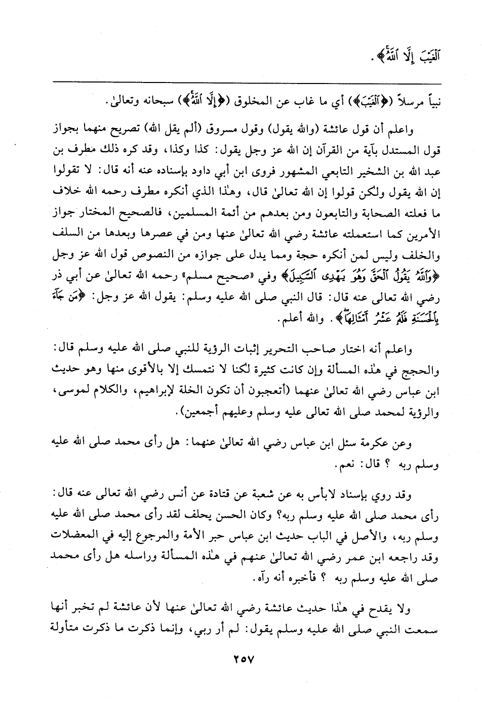 وقد روي بإسناد لا بأس به عن شعبة عن قتادة عن أنس رضي الله تعالى عنه قال: رأى محمد صلى الله عليه وسلم ربه؟ وكان الحسن يحلف لقد رأى محمد صلى الله عليه وسلم ربه، والأصل في الباب حديث ابن عباس حبر الأمة والمرجوع إليه في المعضلات وقد راجعه ابن عمر رضي الله تعالى عنهم في هذه المسألة وراسله هل رأى محمد صلى الله عليه وسلم ربه؟ فأخبره أنه رآه.