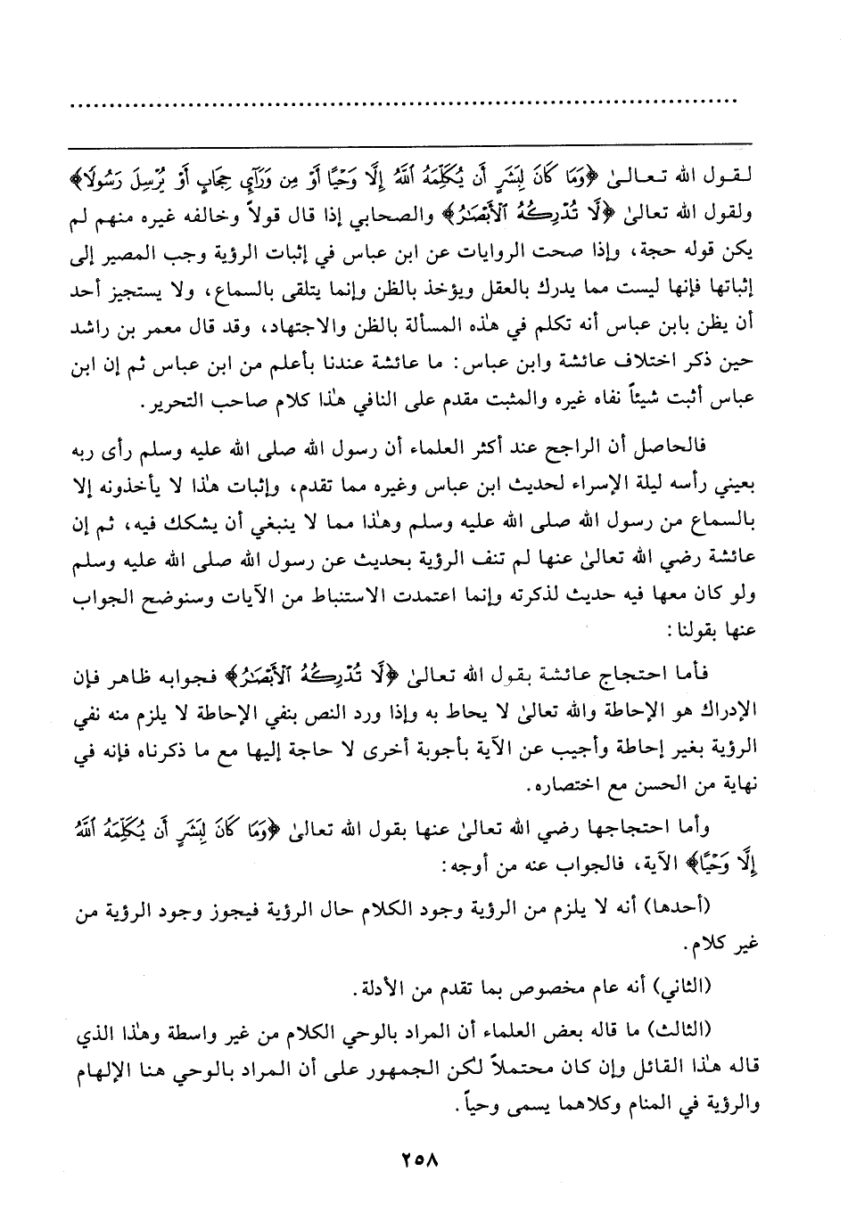 وأما احتجاجها رضي الله تعالى عنها بقول الله تعالى {وَمَا كَانَ لِبَشَرٍ أَنْ يُكَلِّمَهُ اللَّهُ إلا وَحْيًا} الآية، فالجواب عنه من أوجه: