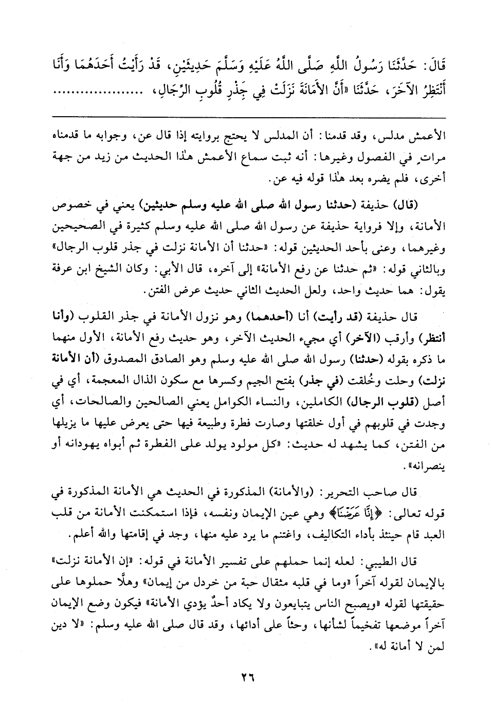 قَال: حَدَّثَنَا رَسُولُ اللهِ صَلَّى اللهُ عَلَيهِ وَسَلَّمَ حَدِيثَينِ، قَدْ رَأَيتُ أَحَدَهُمَا وَأَنا أَنْتَظِرُ الآخَرَ، حَدَّثَنَا "أَنَّ الأَمَانَةَ نَزَلَتْ في جِذرِ قُلُوبِ الرِّجَالِ،