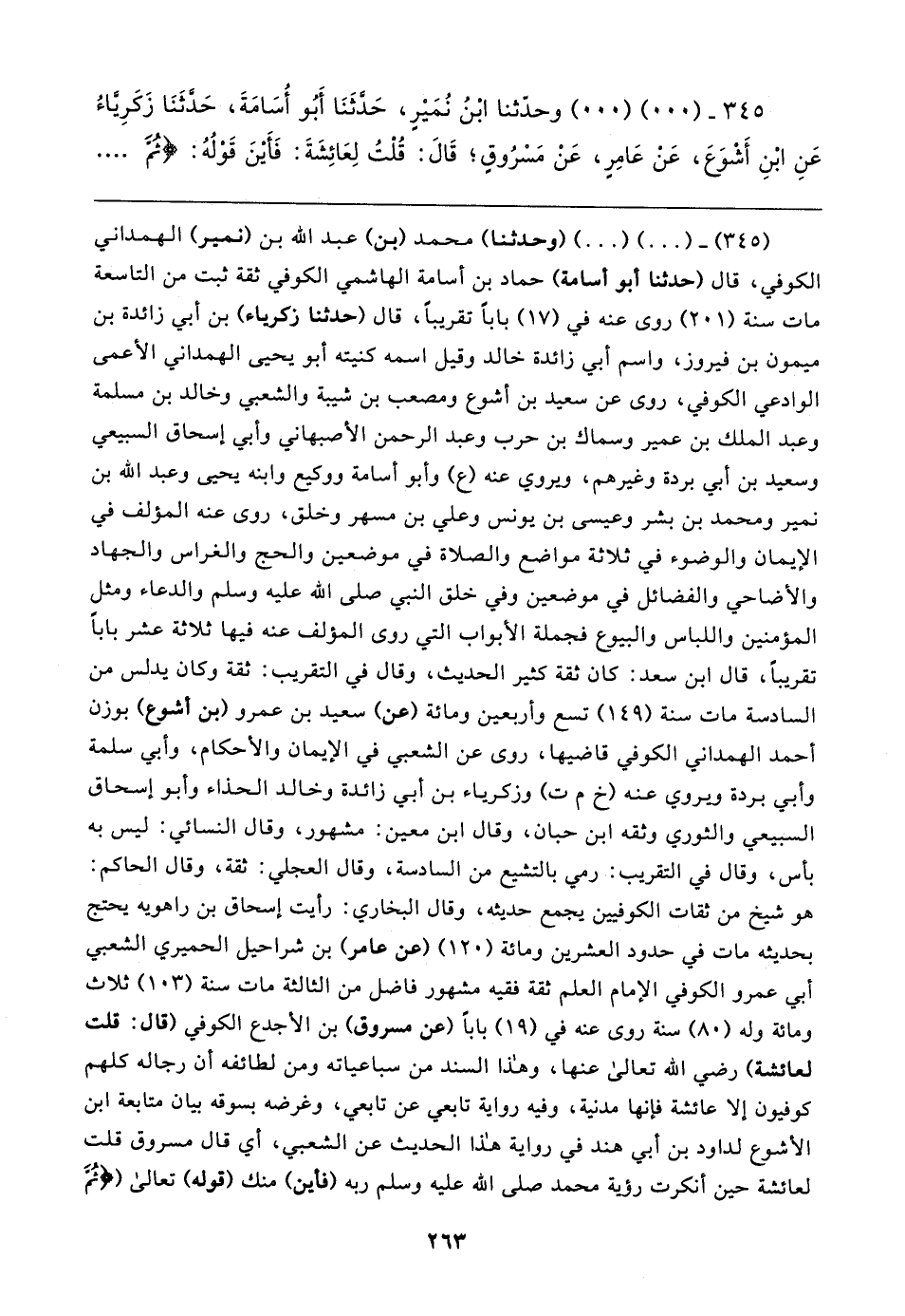 ٣٤٥ - (٠٠) (٠٠) وحدّثنا ابْنُ نُمَيرٍ، حَدَّثَنَا أَبُو أُسَامَةَ، حَدَّثَنَا زَكَرِيَّاءُ عَنِ ابْنِ أَشْوَعَ، عَنْ عَامِرٍ، عَنْ مَسْرُوقٍ؛ قَال: قُلْتُ لِعَائِشَةَ: فَأَينَ قَوْلُهُ: (ثُمَّ