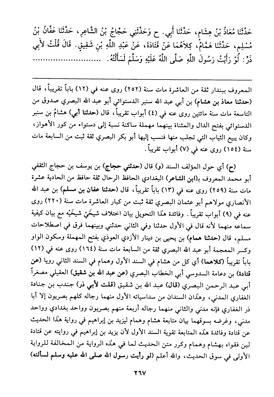(ح) أي حول المؤلف السند (و) قال (حدثني حجاج) بن يوسف بن حجاج الثقفي أبو محمد المعروف بـ (ابن الشاعر) البغدادي الحافظ الرحال ثقة حافظ من الحادية عشرة مات سنة (٢٥٩) روى عنه في (١٣) بابًا تقريبًا، قال (حدثنا عفان بن مسلم) بن عبد الله الأنصاري مولاهم أبو عثمان البصري ثقة ثبت من كبار العاشرة مات سنة (٢٢٠) روى عنه في (٩) أبواب تقريبًا. وفائدة هذا التحويل بيان اختلاف شيخَي شيخَيه مع بيان كيفية سماعه منهما لأنه قال في الأول حدثنا وفي الثاني حدثني وبينهما فرق في اصطلاحات مسلم، قال (حدثنا همام) بن يحيى بن دينار الأزدي العوذي بفتح المهملة وسكون الواو وكسر المعجمة أبو عبد الله البصري ثقة من السابعة مات سنة (١٦٤) روى عنه في (١٢) بابًا تقريبًا كلاهما) أي كل من هشام في السند الأول وهمام في السند الثاني رويا (عن قتادة) بن دعامة السدوسي أبي الخطاب البصري (عن عبد الله بن شقيق) العقيلي مصغرًا أبي عبد الرحمن البصري (قال) عبد الله بن شقيق (قلت لأبي ذر) جندب بن جنادة الغفاري المدني، وهذان السندان من سداسياته الأول منهما رجاله كلهم بصريون إلا أبا ذر الغفاري فإنه مدني والثاني منهما رجاله أربعة منهم بصريون وواحد بغدادي وواحد مدني، وغرضه بسوقهما بيان متابعة هشام وهمام ليزيد بن إبراهيم في رواية هذا الحديث عن قتادة وفائدة هذه المتابعة تقوية السند الأول لأن يزيد بن إبراهيم في روايته عن قتادة لين فقواه بهشام وهمام وكرر متن الحديث لما في هذه الرواية من المخالفة للرواية الأولى في سوق الحديث، والله أعلم (لو رأيت رسول الله صلى الله عليه وسلم لسألته)