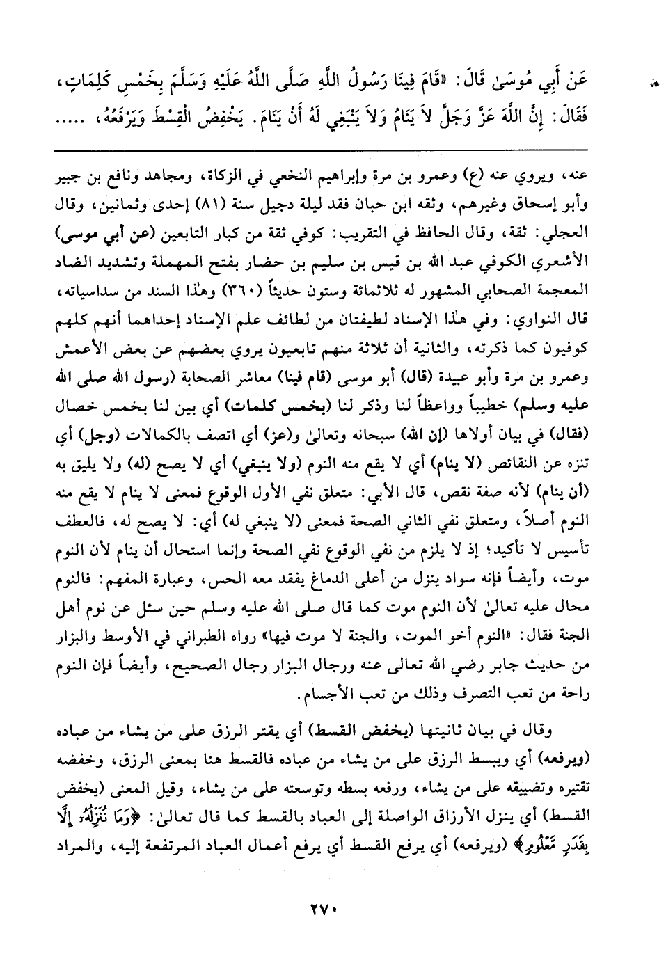 عَنْ أَبِي مُوسَى قَال: "قَامَ فِينَا رَسُولُ اللهِ صَلَّى اللهُ عَلَيهِ وَسَلَّمَ بِخَمْسِ كَلِمَاتٍ، فَقَال: إِن اللهَ عَزَّ وَجَلَّ لَا يَنَامُ وَلَا يَنْبَغِي لَهُ أَنْ يَنَامَ. يَخفِضُ الْقِسْطَ وَيَرْفَعُهُ،