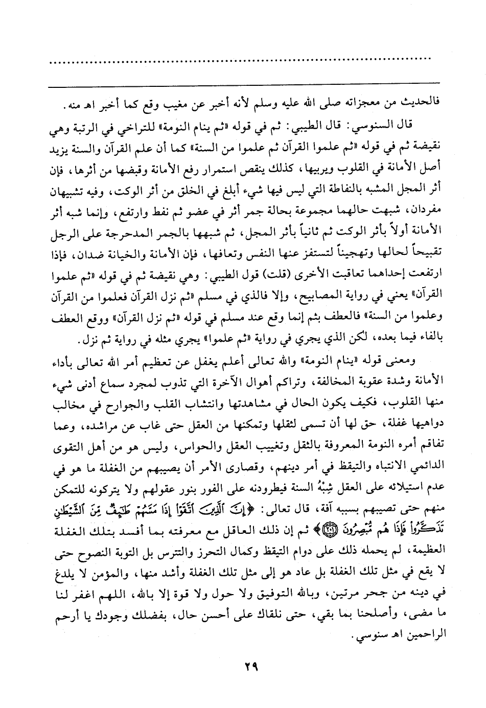 ومعنى قوله "ينام النومة" والله تعالى أعلم يغفل عن تعظيم أمر الله تعالى بأداء الأمانة وشدة عقوبة المخالفة، وتراكم أهوال الآخرة التي تذوب لمجرد سماع أدنى شيء منها القلوب، فكيف يكون الحال في مشاهدتها وانتشاب القلب والجوارح في مخالب دواهيها غفلة، حق لها أن تسمى لثقلها وتمكنها من العقل حتى غاب عن مراشده، وعما تفاقم أمره النومة المعروفة بالثقل وتغييب العقل والحواس، وليس هو من أهل التقوى الدائمي الانتباه والتيقظ في أمر دينهم، وقصارى الأمر أن يصيبهم من الغفلة ما هو في عدم استيلائه على العقل شِبْهُ السنة فيطرودنه على الفور بنور عقولهم ولا يتركونه للتمكن منهم حتى تصيبهم بسببه آفة، قال تعالى: {إِنَّ الَّذِينَ اتَّقَوْا إِذَا مَسَّهُمْ طَائِفٌ مِنَ الشَّيطَانِ تَذَكَّرُوا فَإِذَا هُمْ مُبْصِرُونَ (٢٠١)} ثم إن ذلك العاقل مع معرفته بما أفسد بتلك الغفلة العظيمة، لم يحمله ذلك على دوام التيقظ وكمال التحرز والتترس بل التوبة النصوح حتى لا يقع في مثل تلك الغفلة بل عاد هو إلى مثل تلك الغفلة وأشد منها، والمؤمن لا يلدغ في دينه من جحر مرتين، وبالله التوفيق ولا حول ولا قوة إلا بالله، اللهم اغفر لنا ما مضى، وأصلحنا بما بقي، حتى نلقاك على أحسن حال، بفضلك وجودك يا أرحم الراحمين اهـ سنوسي.