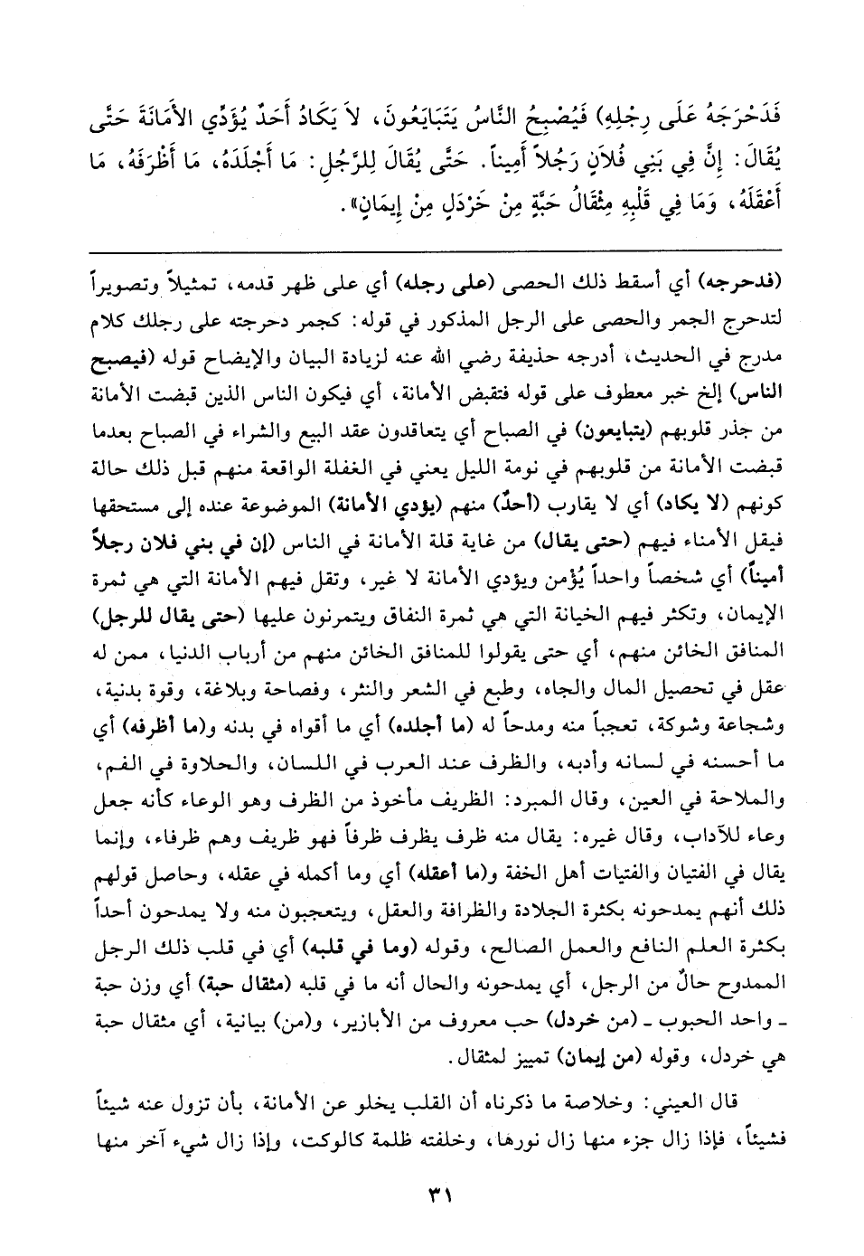 (فدحرجه) أي أسقط ذلك الحصى (على رجله) أي على ظهر قدمه، تمثيلًا وتصويرًا لتدحرج الجمر والحصى على الرجل المذكور في قوله: كجمر دحرجته على رجلك كلام مدرج في الحديث، أدرجه حذيفة رضي الله عنه لزيادة البيان والإيضاح قوله (فيصبح الناس) إلخ خبر معطوف على قوله فتقبض الأمانة، أي فيكون الناس الذين قبضت الأمانة من جذر قلوبهم (يتبايعون) في الصباح أي يتعاقدون عقد البيع والشراء في الصباح بعدما قبضت الأمانة من قلوبهم في نومة الليل يعني في الغفلة الواقعة منهم قبل ذلك حالة كونهم (لا يكاد) أي لا يقارب (أحدٌ) منهم (يؤدي الأمانة) الموضوعة عنده إلى مستحقها فيقل الأمناء فيهم (حتى يقال) من غاية قلة الأمانة في الناس (إن في بني فلان رجلًا أمينًا) أي شخصًا واحدًا يُؤْمن ويؤدي الأمانة لا غير، وتقل فيهم الأمانة التي هي ثمرة الإيمان، وتكثر فيهم الخيانة التي هي ثمرة النفاق ويتمرنون عليها (حتى يقال للرجل) المنافق الخائن منهم، أي حتى يقولوا للمنافق الخائن منهم من أرباب الدنيا، ممن له عقل في تحصيل المال والجاه، وطبع في الشعر والنثر، وفصاحة وبلاغة، وقوة بدنية، وشجاعة وشوكة، تعجبًا منه ومدحًا له (ما أجلده) أي ما أقواه في بدنه و (ما أظرفه) أي ما أحسنه في لسانه وأدبه، والظرف عند العرب في اللسان، والحلاوة في الفم، والملاحة في العين، وقال المبرد: الظريف مأخوذ من الظرف وهو الوعاء كأنه جعل وعاء للآداب، وقال غيره: يقال منه ظرف يظرف ظرفًا فهو ظريف وهم ظرفاء، وإنما يقال في الفتيان والفتيات أهل الخفة و (ما أعقله) أي وما أكمله في عقله، وحاصل قولهم ذلك أنهم يمدحونه بكثرة الجلادة والظرافة والعقل، ويتعجبون منه ولا يمدحون أحدًا بكثرة العلم النافع والعمل الصالح، وقوله (وما في قلبه) أي في قلب ذلك الرجل الممدوح حالٌ من الرجل، أي يمدحونه والحال أنه ما في قلبه (مثقال حبة) أي وزن حبة - واحد الحبوب - (من خردل) حب معروف من الأبازير، و (من) بيانية، أي مثقال حبة هي خردل، وقوله (من إيمان) تمييز لمثقال.