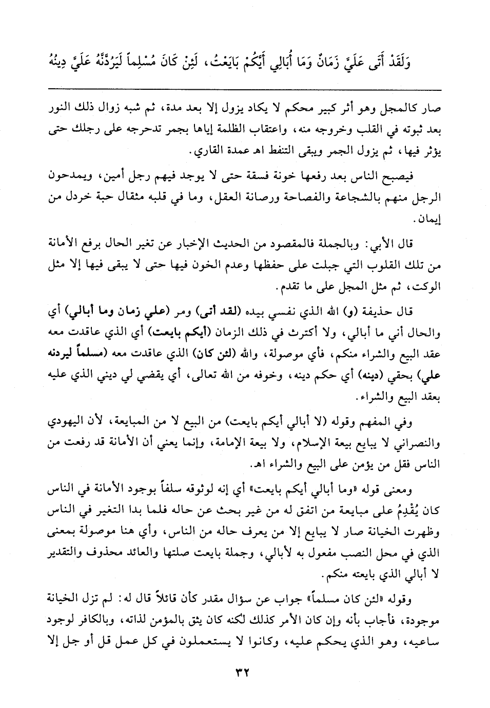 قال حذيفة (و) الله الذي نفسي بيده (لقد أتى) ومر (علي زمان وما أبالي) أي والحال أني ما أبالي، ولا أكترث في ذلك الزمان (أيكم بايعت) أي الذي عاقدت معه عقد البيع والشراء منكم، فأي موصولة، والله (لئن كان) الذي عاقدت معه (مسلمًا ليردنه علي) بحقي (دينه) أي حكم دينه، وخوفه من الله تعالى، أي يقضي لي ديني الذي عليه بعقد البيع والشراء.