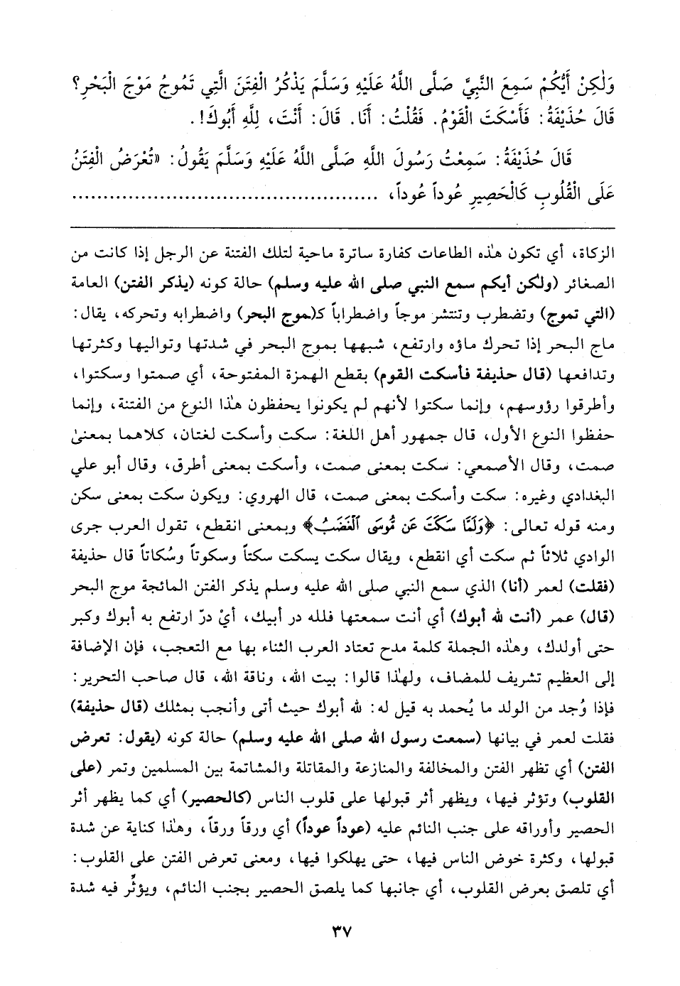 وَلكِنْ أَيكُمْ سَمِعَ النَّبِيَّ - صلى الله عليه وسلم - يَذْكُرُ الفِتَنَ الَّتِي تَمُوجُ مَوْجَ الْبَحْرِ؟ قَال حُذَيفَةُ: فَأَسْكَتَ الْقَوْمُ. فَقُلْتُ: أَنَا. قَال: أَنْتَ، لِلهِ أَبُوكَ! .