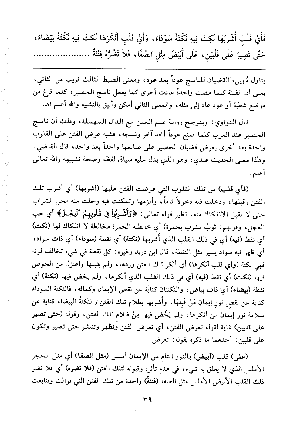 (فأي قلب) من تلك القلوب التي عرضت الفتن عليها (أشربها) أي أشرب تلك الفتن وقبلها، ودخلت فيه دخولًا تامًّا، وألزمها وتمكنت فيه وحلت منه محل الشراب حتى لا تقبل الانفكاك منه، نظير قوله تعالى: {وَأُشْرِبُوا فِي قُلُوبِهِمُ الْعِجْلَ} أي حب العجل، وقولهم: ثوبٌ مشرب بحمرة) أي خالطته الحمرة مخالطة لا انفكاك لها (نكت) أي نقط (فيه) أي في ذلك القلب الذي أُشربها (نكتة) أي نقطة (سوداء) أي ذات سواد، أي ظهر فيه سواد يسير مثل النقطة، قال ابن دريد وغيره: كل نقطة في شيء تخالف لونه فهي نكتة (وأي قلب أنكرها) أي أنكر تلك الفتن وردها، ولم يقبلها واعتزل من الخوض فيها (نكت) أي نقط (فيه) أي في ذلك القلب الذي أنكرها، ولم يخض فيها (نكتة) أي نقطة (بيضاء) أي ذات بياض، والنكتتان كناية عن نقص الإيمان وكماله، فالنكتة السوداء كناية عن نقصِ نورِ إيمانِ مَنْ قَبِلهَا، وأُشربها بظلام تلك الفتن والنكتةُ البيضاء كناية عن سلامة نور إيمان من أنكرها، ولم يَخُض فيها مِنْ ظلامِ تلك الفتن، وقوله (حتى تصير على قلبين) غاية لقوله تعرض الفتن، أي تعرض الفتن وتظهر وتنتشر حتى تصير وتكون على قلبين: أحدهما ما ذكره بقوله: تعرض.
