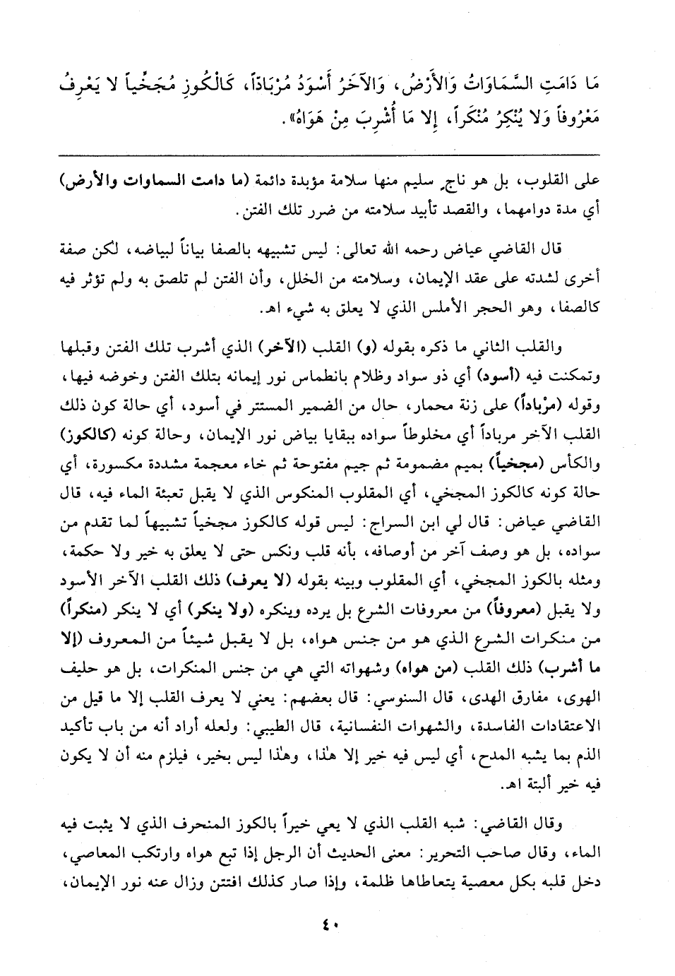 والقلب الثاني ما ذكره بقوله (و) القلب (الآخر) الذي أشرب تلك الفتن وقبلها وتمكنت فيه (أسود) أي ذو سواد وظلام بانطماس نور إيمانه بتلك الفتن وخوضه فيها، وقوله (مرْبادًا) على زنة محمار، حال من الضمير المستتر في أسود، أي حالة كون ذلك القلب الآخر مربادًا أي مخلوطًا سواده ببقايا بياض نور الإيمان، وحالة كونه (كالكوز) والكأس (مجخيًا) بميم مضمومة ثم جيم مفتوحة ثم خاء معجمة مشددة مكسورة، أي حالة كونه كالكوز المجخي، أي المقلوب المنكوس الذي لا يقبل تعبئة الماء فيه، قال القاضي عياض: قال لي ابن السراج: ليس قوله كالكوز مجخيًا تشبيهًا لما تقدم من سواده، بل هو وصف آخر من أوصافه، بأنه قلب ونكس حتى لا يعلق به خير ولا حكمة، ومثله بالكوز المجخي، أي المقلوب وبينه بقوله (لا يعرف) ذلك القلب الآخر الأسود ولا يقبل (معروفًا) من معروفات الشرع بل يرده وينكره (ولا ينكر) أي لا ينكر (منكرًا) من منكرات الشرع الذي هو من جنس هواه، بل لا يقبل شيئًا من المعروف (إلا ما أشرب) ذلك القلب (من هواه) وشهواته التي هي من جنس المنكرات، بل هو حليف الهوى، مفارق الهدى، قال السنوسي: قال بعضهم: يعني لا يعرف القلب إلا ما قيل من الاعتقادات الفاسدة، والشهوات النفسانية، قال الطيبي: ولعله أراد أنه من باب تأكيد الذم بما يشبه المدح، أي ليس فيه خير إلا هذا، وهذا ليس بخير، فيلزم منه أن لا يكون فيه خير ألبتة اهـ.