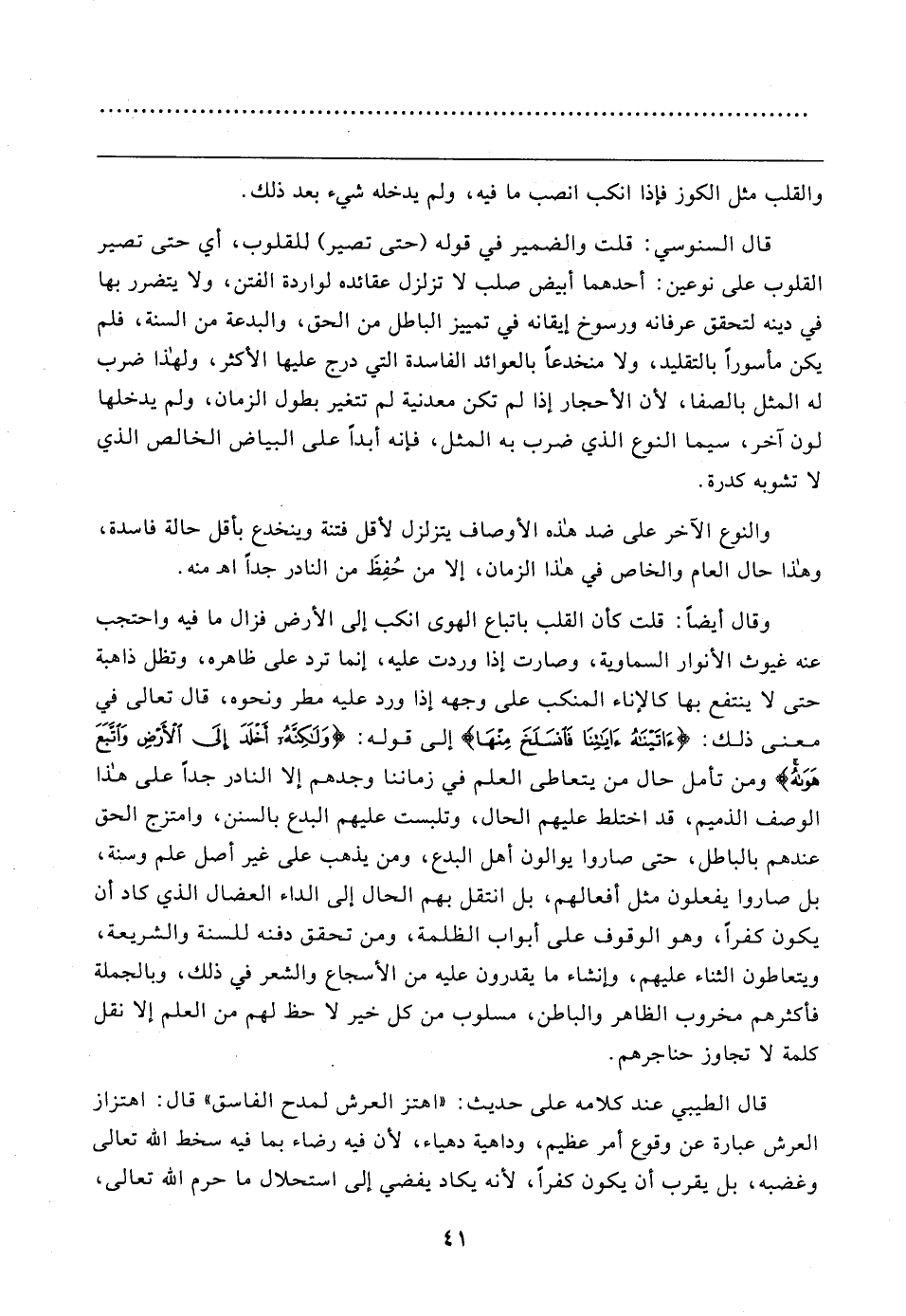وقال أيضًا: قلت كأن القلب باتباع الهوى انكب إلى الأرض فزال ما فيه واحتجب عنه غيوث الأنوار السماوية، وصارت إذا وردت عليه، إنما ترد على ظاهره، وتظل ذاهبة حتى لا ينتفع بها كالإناء المنكب على وجهه إذا ورد عليه مطر ونحوه، قال تعالى في معنى ذلك: {آتَينَاهُ آيَاتِنَا فَانْسَلَخَ مِنْهَا} إلى قوله: {وَلَكِنَّهُ أَخْلَدَ إِلَى الْأَرْضِ وَاتَّبَعَ هَوَاهُ} ومن تأمل حال من يتعاطى العلم في زماننا وجدهم إلا النادر جدًّا على هذا الوصف الذميم، قد اختلط عليهم الحال، وتلبست عليهم البدع بالسنن، وامتزج الحق عندهم بالباطل، حتى صاروا يوالون أهل البدع، ومن يذهب على غير أصل علم وسنة، بل صاروا يفعلون مثل أفعالهم، بل انتقل بهم الحال إلى الداء العضال الذي كاد أن يكون كفرًا، وهو الوقوف على أبواب الظلمة، ومن تحقق دفنه للسنة والشريعة، ويتعاطون الثناء عليهم، وإنشاء ما يقدرون عليه من الأسجاع والشعر في ذلك، وبالجملة فأكثرهم مخروب الظاهر والباطن، مسلوب من كل خير لا حظ لهم من العلم إلا نقل كلمة لا تجاوز حناجرهم.