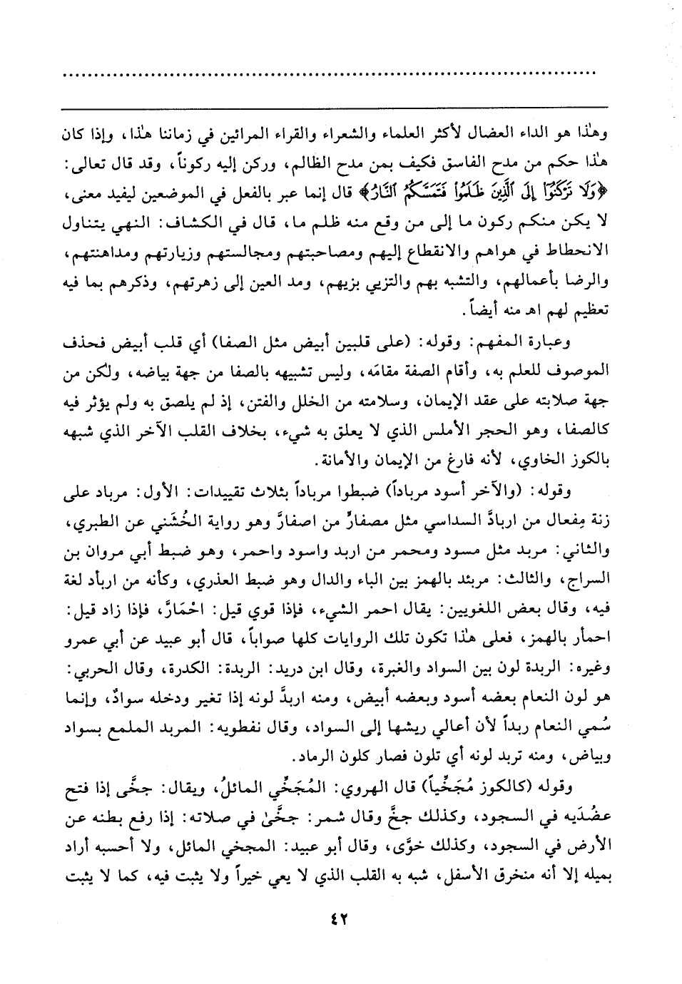 وهذا هو الداء العضال لأكثر العلماء والشعراء والقراء المرائين في زماننا هذا، وإذا كان هذا حكم من مدح الفاسق فكيف بمن مدح الظالم، وركن إليه ركونًا، وقد قال تعالى: {وَلَا تَرْكَنُوا إِلَى الَّذِينَ ظَلَمُوا فَتَمَسَّكُمُ النَّارُ} قال إنما عبر بالفعل في الموضعين ليفيد معنى، لا يكن منكم ركون ما إلى من وقع منه ظلم ما، قال في الكشاف: النهي يتناول الانحطاط في هواهم والانقطاع إليهم ومصاحبتهم ومجالستهم وزيارتهم ومداهنتهم، والرضا بأعمالهم، والتشبه بهم والتزي بزيهم، ومد العين إلى زهرتهم، وذكرهم بما فيه تعظيم لهم اهـ منه أيضًا.