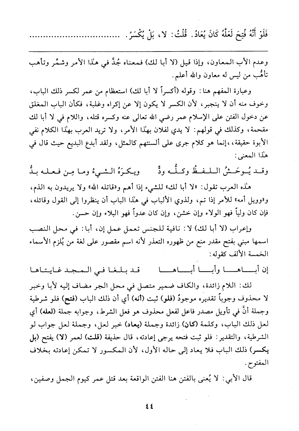 لك: اللام زائدة، والكاف ضمير متصل في محل الجر مضاف إليه لأبا وخبر لا محذوف وجوبًا تقديره موجودٌ (فلو) ثبت (أنه) أي أن ذلك الباب (فتح) فلو شرطية وجملة أن في تأويل مصدر فاعل لفعل محذوف هو فعل الشرط، وجوابه جملة (لعله) أي لعل ذلك الباب، وكلمة (كان) زائدة وجملة (يعاد) خبر لعل، وجملة لعل جواب لو الشرطية، والتقدير: فلو ثبت فتحه يرجى إعادته، قال حذيفة (قلت) لعمر (لا) يفتح (بل يكسر) ذلك الباب فلا يعاد إلى حاله الأول، لأن المكسور لا تمكن إعادته بخلاف المفتوح.