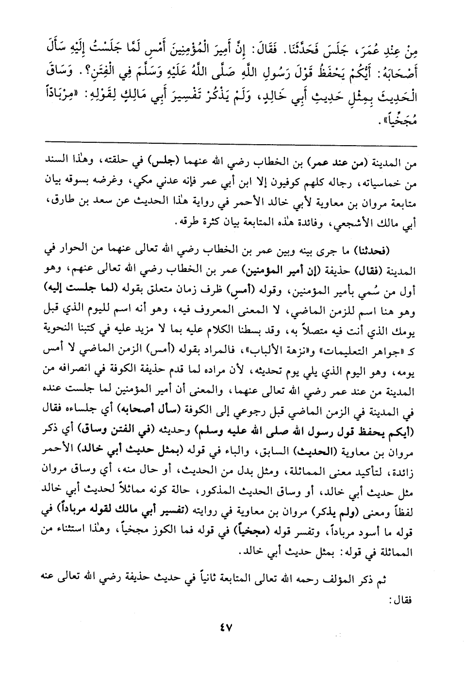 (فحدثنا) ما جرى بينه وبين عمر بن الخطاب رضي الله تعالى عنهما من الحوار في المدينة (فقال) حذيفة (إن أمير المؤمنين) عمر بن الخطاب رضي الله تعالى عنهم، وهو أول من سُمي بأمير المؤمنين، وقوله (أمسِ) ظرف زمان متعلق بقوله (لما جلست إليه) وهو هنا اسم للزمن الماضي، لا المعنى المعروف فيه، وهو أنه اسم لليوم الذي قبل يومك الذي أنت فيه متصلًا به، وقد بسطنا الكلام عليه بما لا مزيد عليه في كتبنا النحوية كـ "جواهر التعليمات" و"نزهة الألباب"، فالمراد بقوله (أمس) الزمن الماضي لا أمس يومه، وهو اليوم الذي يلي يوم تحديثه، لأن مراده لما قدم حذيفة الكوفة في انصرافه من المدينة من عند عمر رضي الله تعالى عنهما، والمعنى أن أمير المؤمنين لما جلست عنده في المدينة في الزمن الماضي قبل رجوعي إلى الكوفة (سأل أصحابه) أي جلساءه فقال (أيكم يحفظ قول رسول الله صلى الله عليه وسلم) وحديثه (في الفتن وساق) أي ذكر مروان بن معاوية (الحديث) السابق، والباء في قوله (بمثل حديث أبي خالد) الأحمر زائدة، لتأكيد معنى المماثلة، ومثل بدل من الحديث، أو حال منه، أي وساق مروان مثل حديث أبي خالد، أو وساق الحديث المذكور، حالة كونه مماثلًا لحديث أبي خالد لفظًا ومعنى (ولم يذكر) مروان بن معاوية في روايته (تفسير أبي مالك لقوله مربادًا) في قوله ما أسود مربادًا، وتفسر قوله (مجخيًا) في قوله فما الكوز مجخيًا، وهذا استثناء من المماثلة في قوله: بمثل حديث أبي خالد.