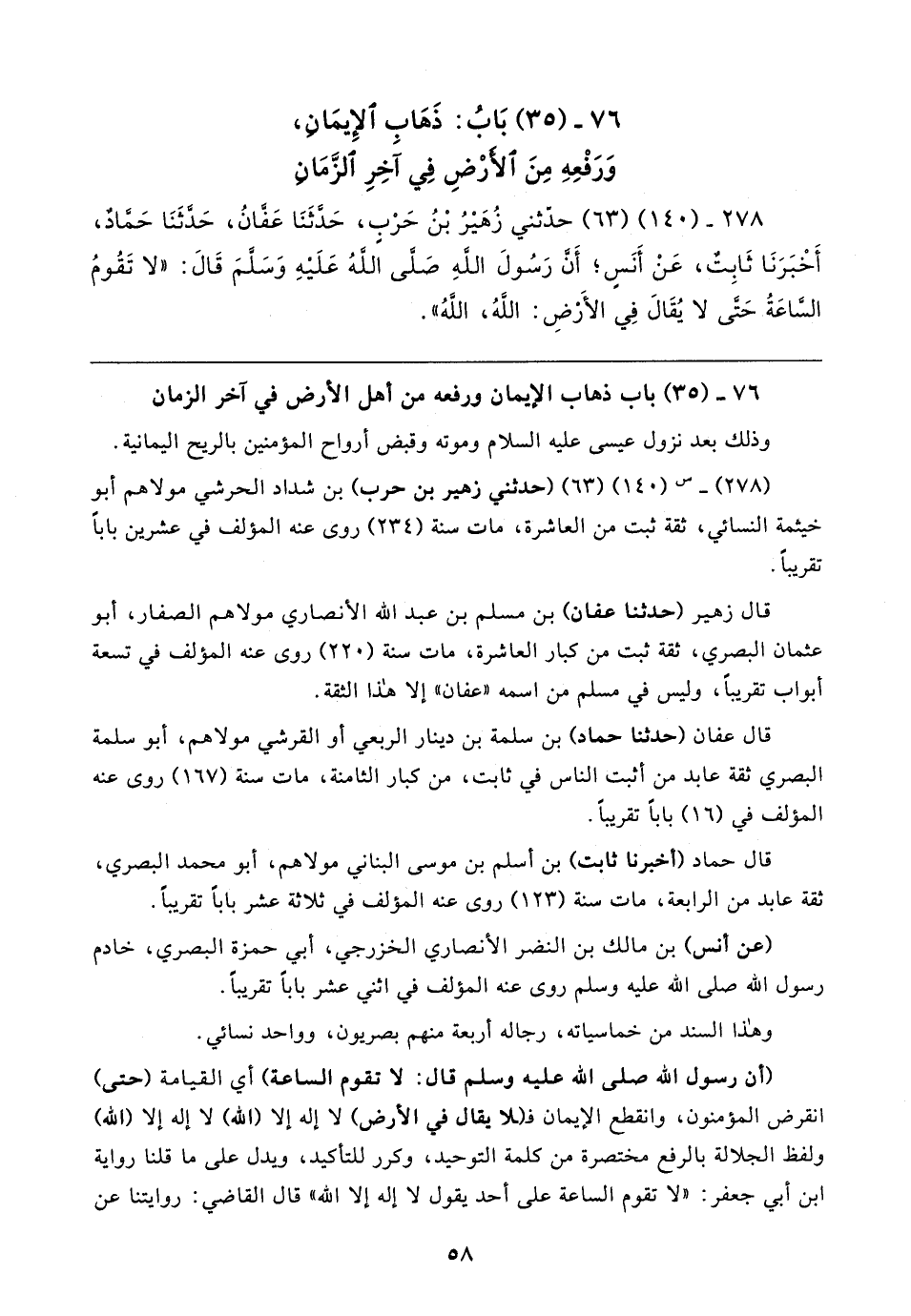 ٢٧٨ - (١٤٠) (٦٣) حدثني زُهَيرُ بْنُ حَرْبٍ، حَدَّثَنَا عَفَّانُ، حَدَّثَنَا حَمَّادٌ، أَخْبَرَنَا ثَابِتٌ، عَنْ أَنَسٍ؛ أن رَسُولَ اللهِ - صلى الله عليه وسلم - قَال: "لا تَقُومُ السَّاعَةُ حَتَّى لا يُقَال في الأرضِ: اللهُ، اللهُ"