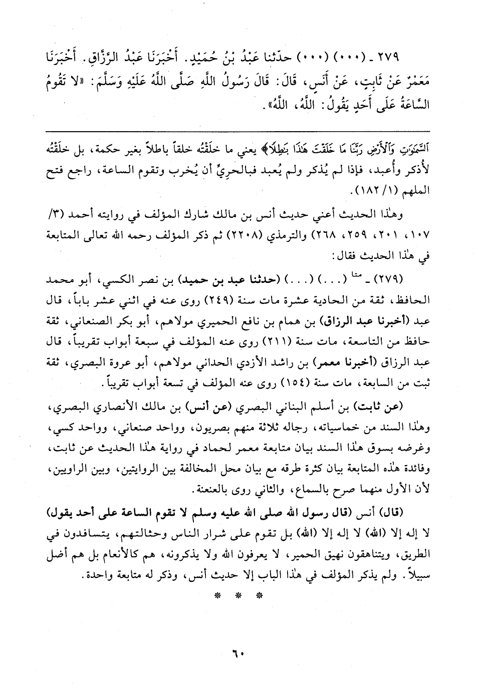 ٢٧٩ - (٠٠) (٠٠) حدَّثنا عَبْدُ بْنُ حُمَيدٍ. أَخْبَرَنَا عَبْدُ الرَّزاقِ. أَخْبَرَنَا مَعَمْرٌ عَنْ ثَابِتٍ، عَنْ أَنَسٍ، قَال: قَال رَسُولُ اللهِ - صلى الله عليه وسلم -: "لا تَقُومُ الساعَةُ عَلَى أَحَدٍ يَقُولُ: اللهُ، اللهُ"