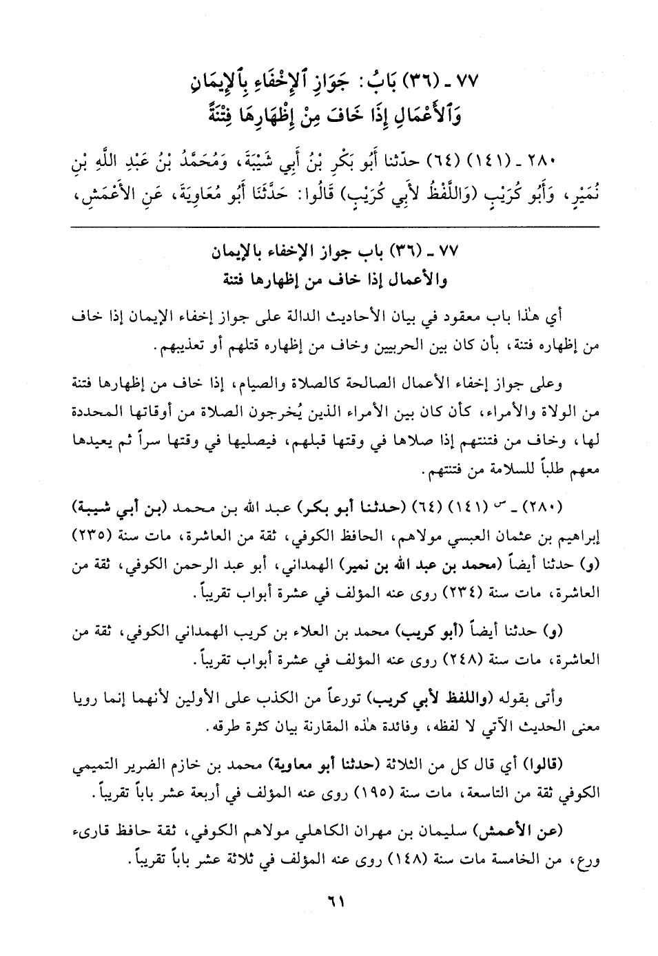 ٧٧ - (٣٦) بَابُ: جَوَازِ الإِخْفَاءِ بِالإِيمَان وَالأعْمَالِ إِذَا خَافَ مِنْ إِظْهَارِهَا فِتْنَةً
