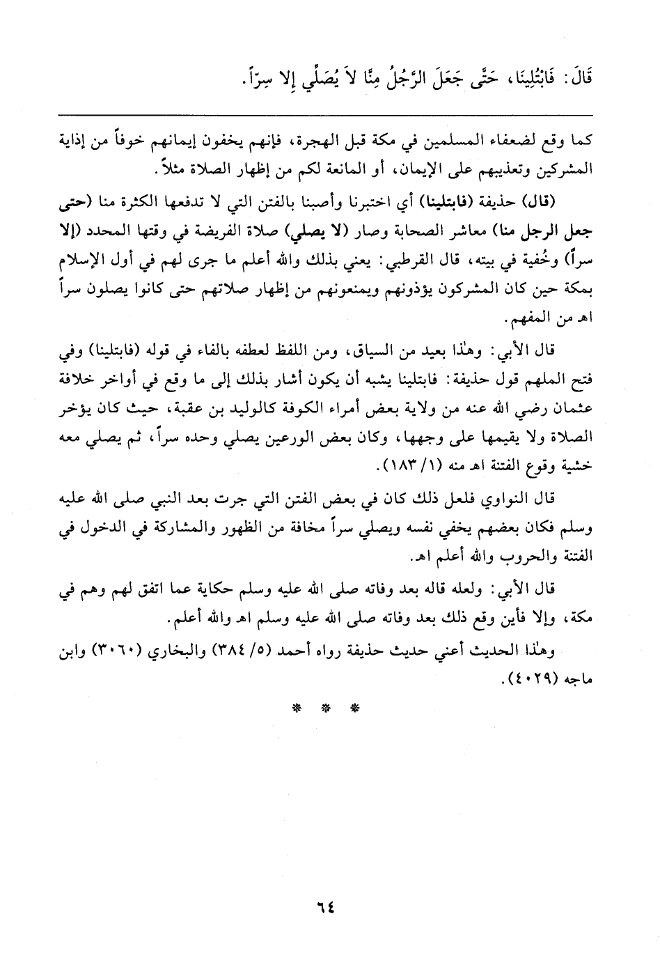قال الأبي: وهذا بعيد من السياق، ومن اللفظ لعطفه بالفاء في قوله (فابتلينا) وفي فتح الملهم قول حذيفة: فابتلينا يشبه أن يكون أشار بذلك إلى ما وقع في أواخر خلافة عثمان رضي الله عنه من ولاية بعض أمراء الكوفة كالوليد بن عقبة، حيث كان يؤخر الصلاة ولا يقيمها على وجهها، وكان بعض الورعين يصلي وحده سرًّا، ثم يصلي معه خشية وقوع الفتنة اهـ منه (١/ ١٨٣).