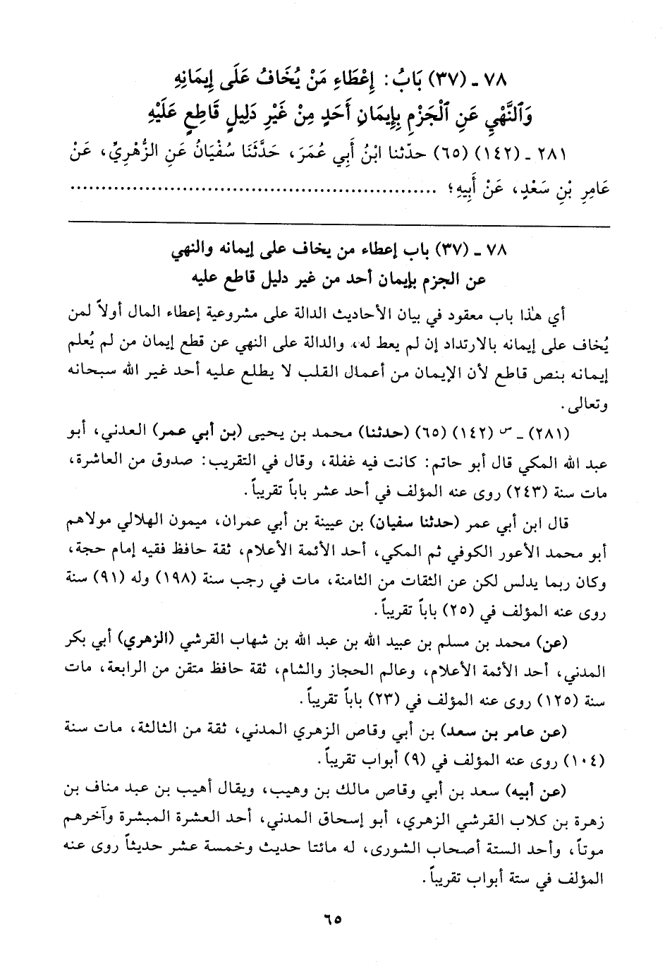 ٧٨ - (٣٧) بَابُ: إِعْطَاءِ مَنْ يُخَافُ عَلَى إيمَانِهِ وَالنَّهْيِ عَنِ الْجَزْمِ بِإِيمَانِ أَحَدٍ مِنْ غيرِ دَليلٍ قَاطِعٍ عَلَيهِ