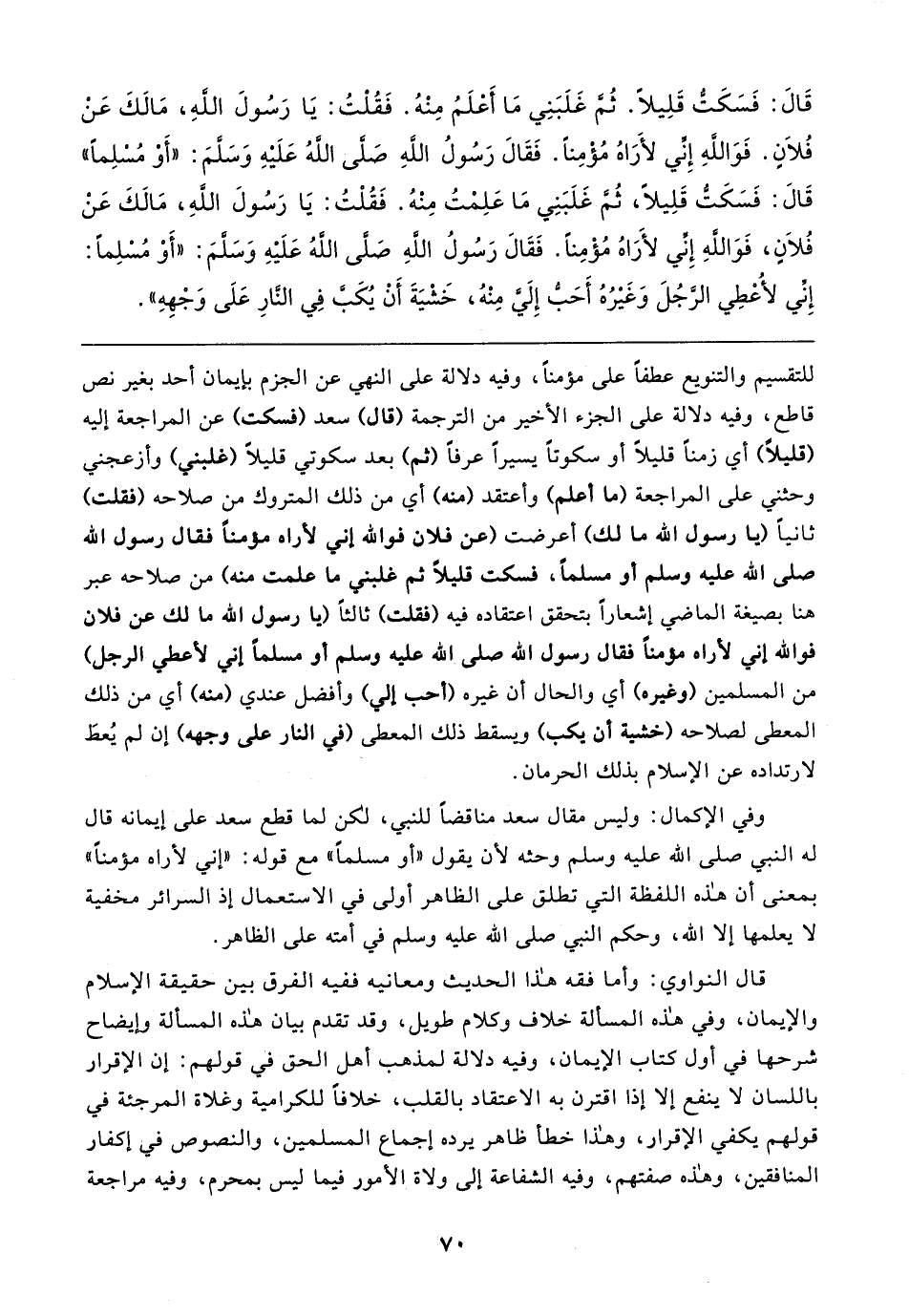 قَال: فَسَكَت قَلِيلًا. ثُم غَلَبَنِي مَا أَعلَمُ مِنْهُ. فَقُلْتُ: يَا رَسُولَ اللهِ، مَا لكَ عَنْ فُلانٍ. فَوَاللهِ إِني لأرَاهُ مُؤمِنًا. فَقَال رَسُولُ اللهِ - صلى الله عليه وسلم -: "أَو مُسْلِمًا" قَال: فَسَكَت قَلِيلًا، ثُمَّ غَلَبَنِي مَا عَلِمْتُ مِنْهُ. فَقُلْتُ: يَا رَسُولَ اللهِ، مَا لكَ عَنْ فُلانِ، فَوَاللهِ إِني لأرَاهُ مُؤْمِنًا. فَقَال رَسُولُ اللهِ - صلى الله عليه وسلم -: "أَوْ مُسْلِمًا: إِنِّي لأُعْطِي الرَّجُلَ وَغَيرُهُ أَحَبُّ إِليَّ مِنْهُ، خَشْيَةَ أَنْ يُكَبَّ في النَّارِ عَلَى وَجْهِهِ"