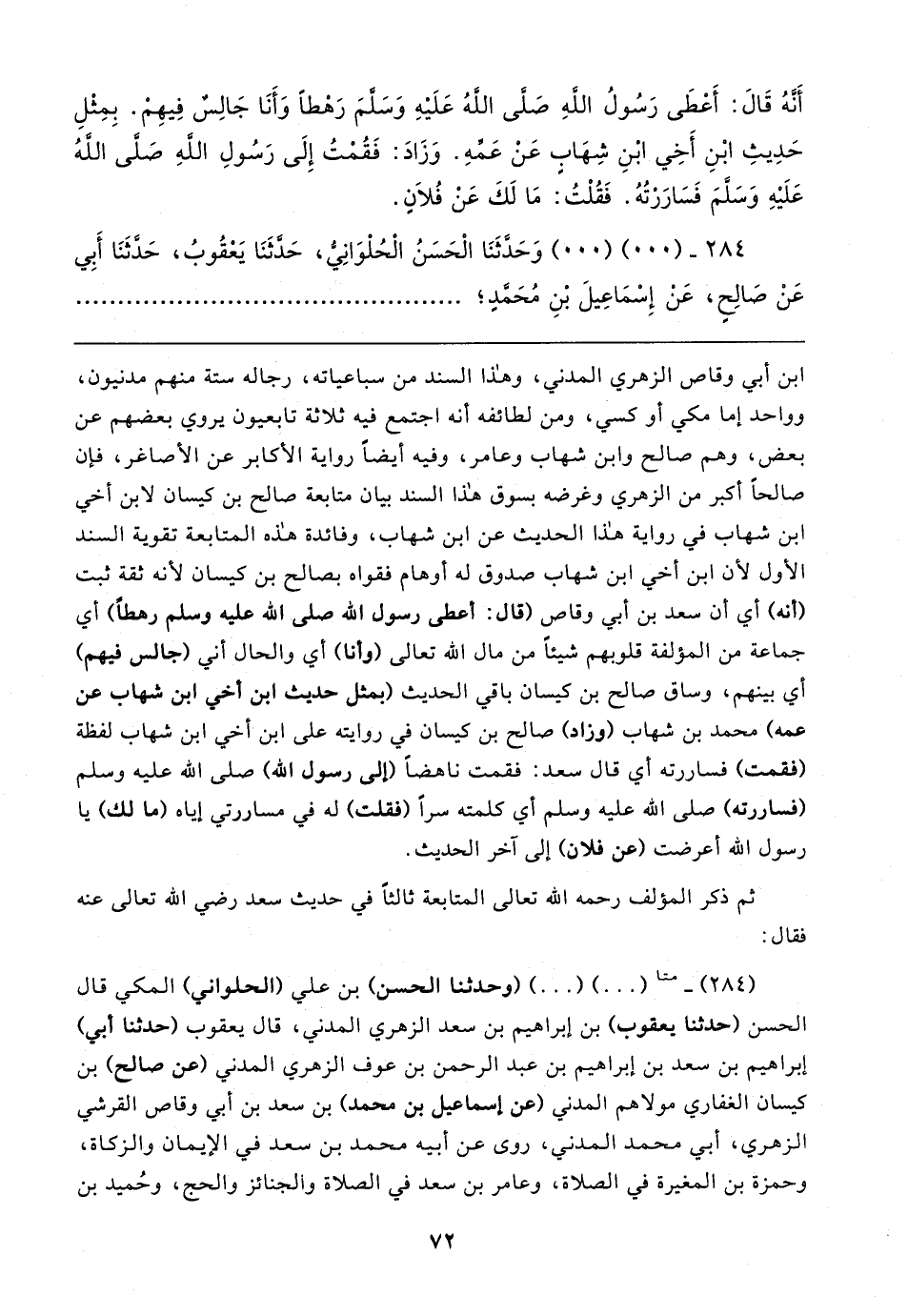 (٢٨٤) - متا (٠٠) (٠٠) (وحدثنا الحسن) بن علي (الحلواني) المكي قال الحسن (حدثنا يعقوب) بن إبراهيم بن سعد الزهري المدني، قال يعقوب (حدثنا أبي) إبراهيم بن سعد بن إبراهيم بن عبد الرحمن بن عوف الزهري المدني (عن صالح) بن كيسان الغفاري مولاهم المدني (عن إسماعيل بن محمد) بن سعد بن أبي وقاص القرشي الزهري، أبي محمد المدني، روى عن أبيه محمد بن سعد في الإيمان والزكاة، وحمزة بن المغيرة في الصلاة، وعامر بن سعد في الصلاة والجنائز والحج، وحُميد بن