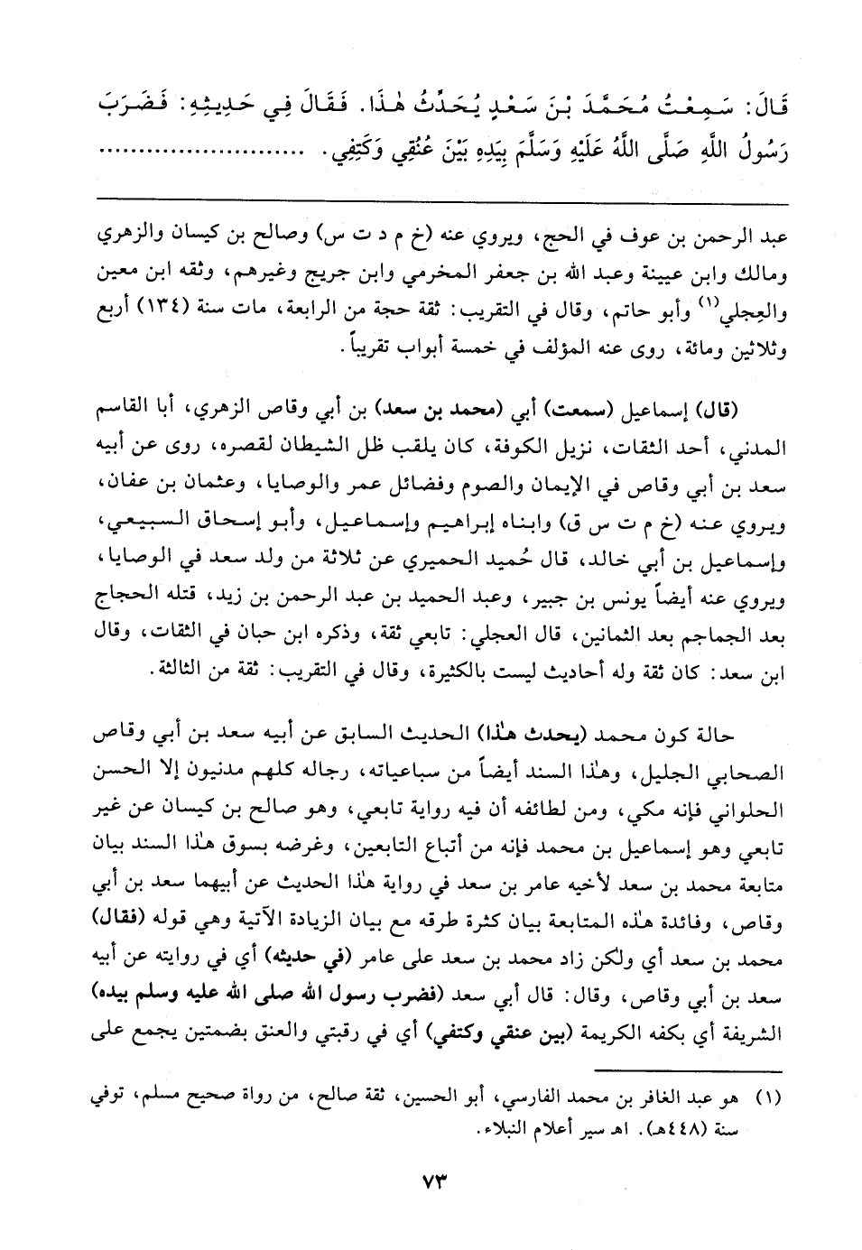 (قال) إسماعيل (سمعت) أبي (محمد بن سعد) بن أبي وقاص الزهري، أبا القاسم المدني، أحد الثقات، نزيل الكوفة، كان يلقب ظل الشيطان لقصره، روى عن أبيه سعد بن أبي وقاص في الإيمان والصوم وفضائل عمر والوصايا، وعثمان بن عفان، ويروي عنه (خ م ت س ق) وابناه إبراهيم وإسماعيل، وأبو إسحاق السبيعي، وإسماعيل بن أبي خالد، قال حُميد الحميري عن ثلاثة من ولد سعد في الوصايا، ويروي عنه أيضًا يونس بن جبير، وعبد الحميد بن عبد الرحمن بن زيد، قتله الحجاج بعد الجماجم بعد الثمانين، قال العجلي: تابعي ثقة، وذكره ابن حبان في الثقات، وقال ابن سعد: كان ثقة وله أحاديث ليست بالكثيرة، وقال في التقريب: ثقة من الثالثة.