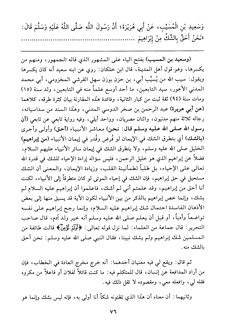 وَسَعِيدِ بْنِ الْمُسَيَّبِ، عَنْ أَبِي هُرَيرَةَ؛ أَن رَسُولَ اللهِ صلى اللهُ عَلَيهِ وَسلمَ قَال: "نَحْنُ أَحَقُّ بِالشَّكِّ مِنْ إِبْرَاهِيمَ
